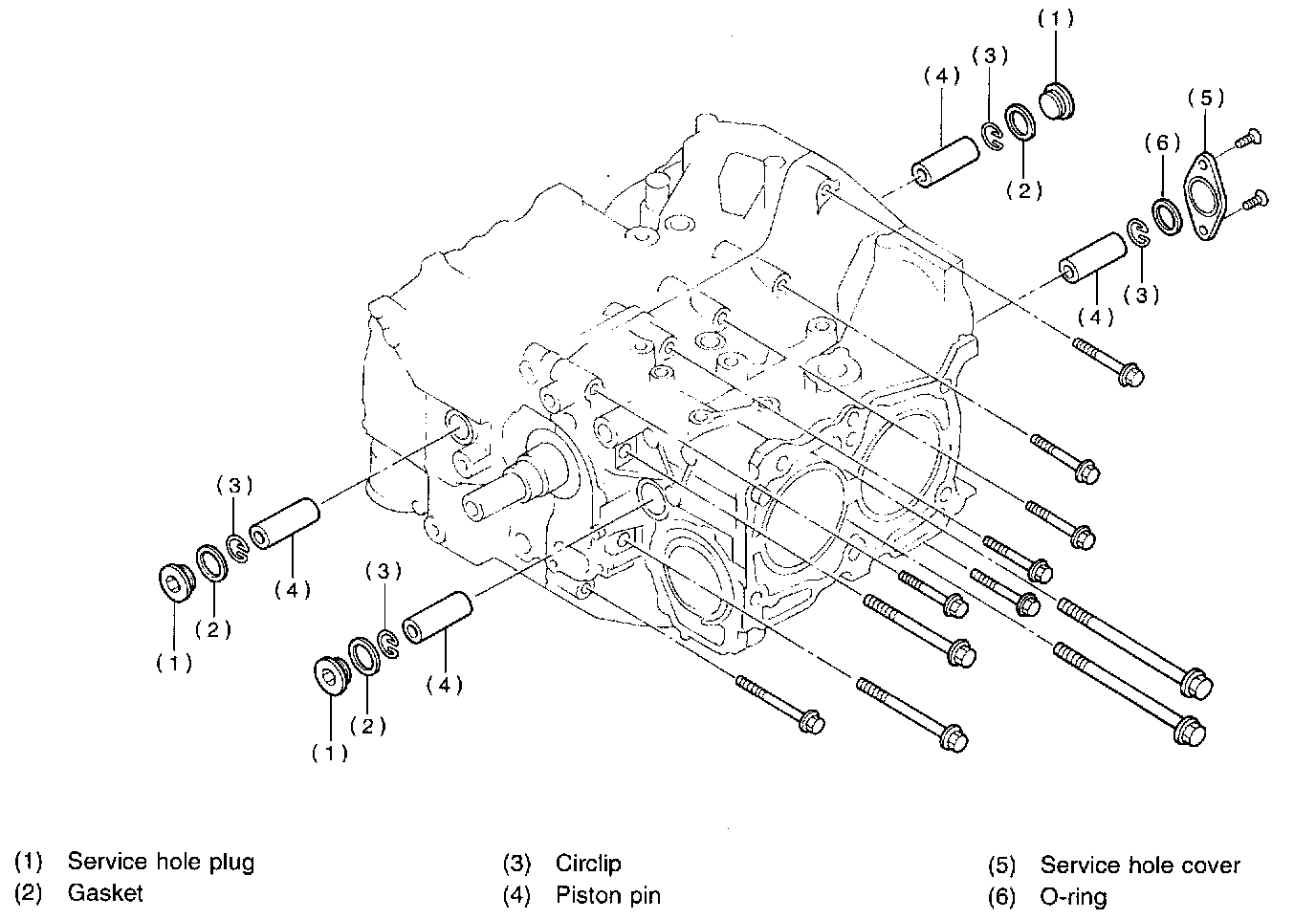 28) Rotate crankshaft to bring #1 and #2 pistons to bottom dead center position, then remove piston circlip through service hole of #1 and #2 cylinders.