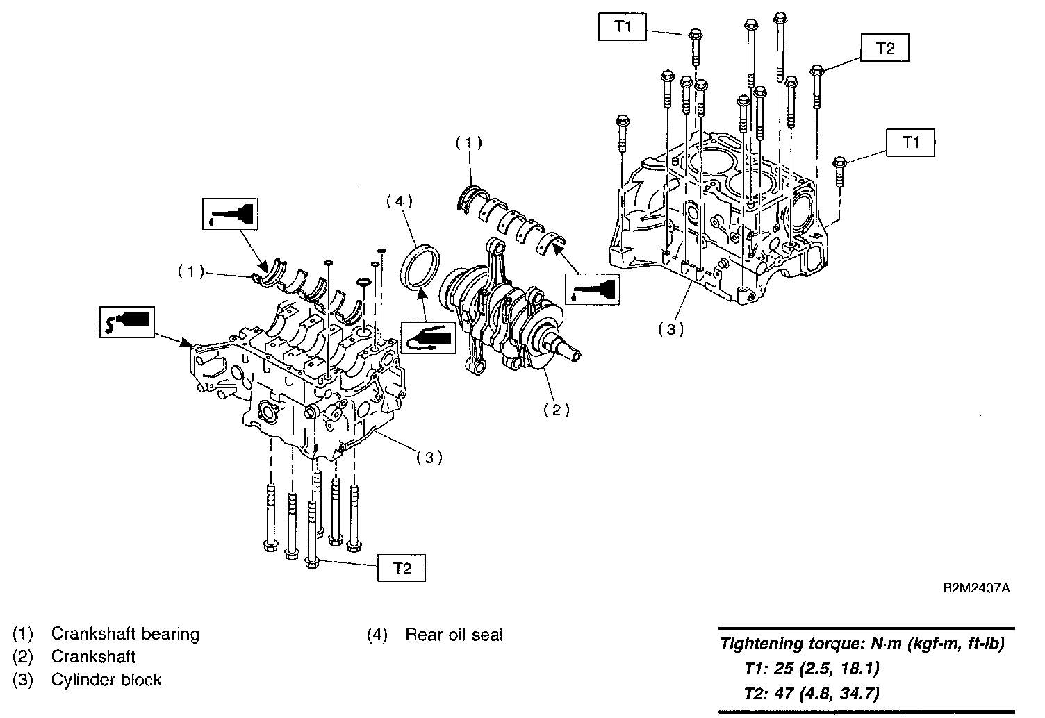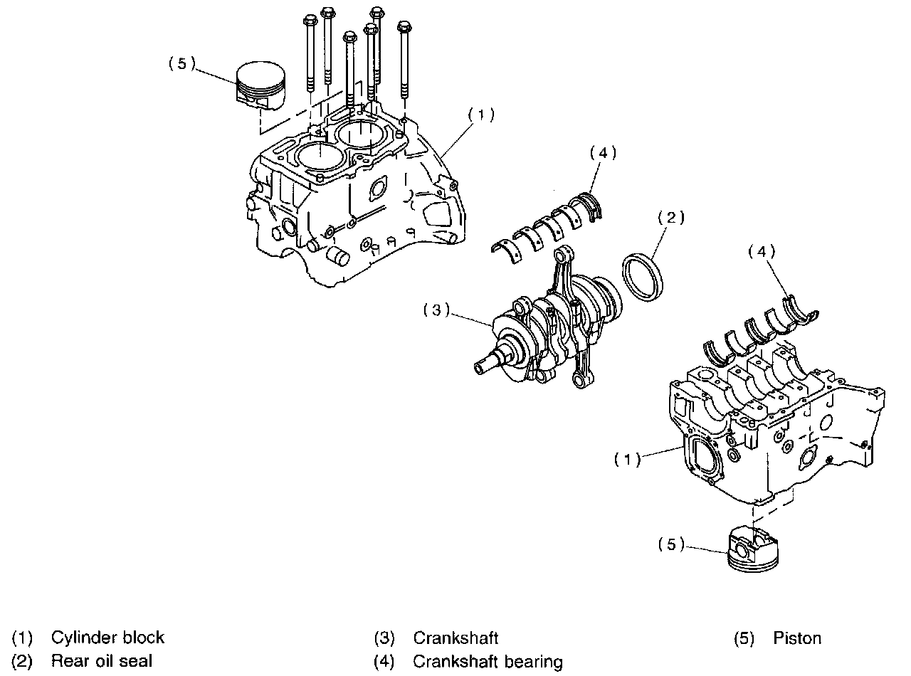 CAUTION: Remove oil in the mating surface of bearing and cylinder block before installation. Also apply a coat of engine oil to crankshaft pins.
