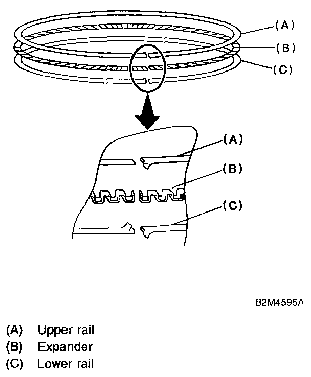 ^ Oil ring consists of upper rail, expander and lower rail. When installing on piston, be careful of each rail's direction.