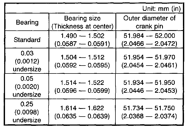 e) Measure the oil clearance on individual connecting rod bearings by means of plastigauge. If any oil clearance is not within specification, replace the defective bearing with a new one of standard size or undersize as necessary. (See the table.)