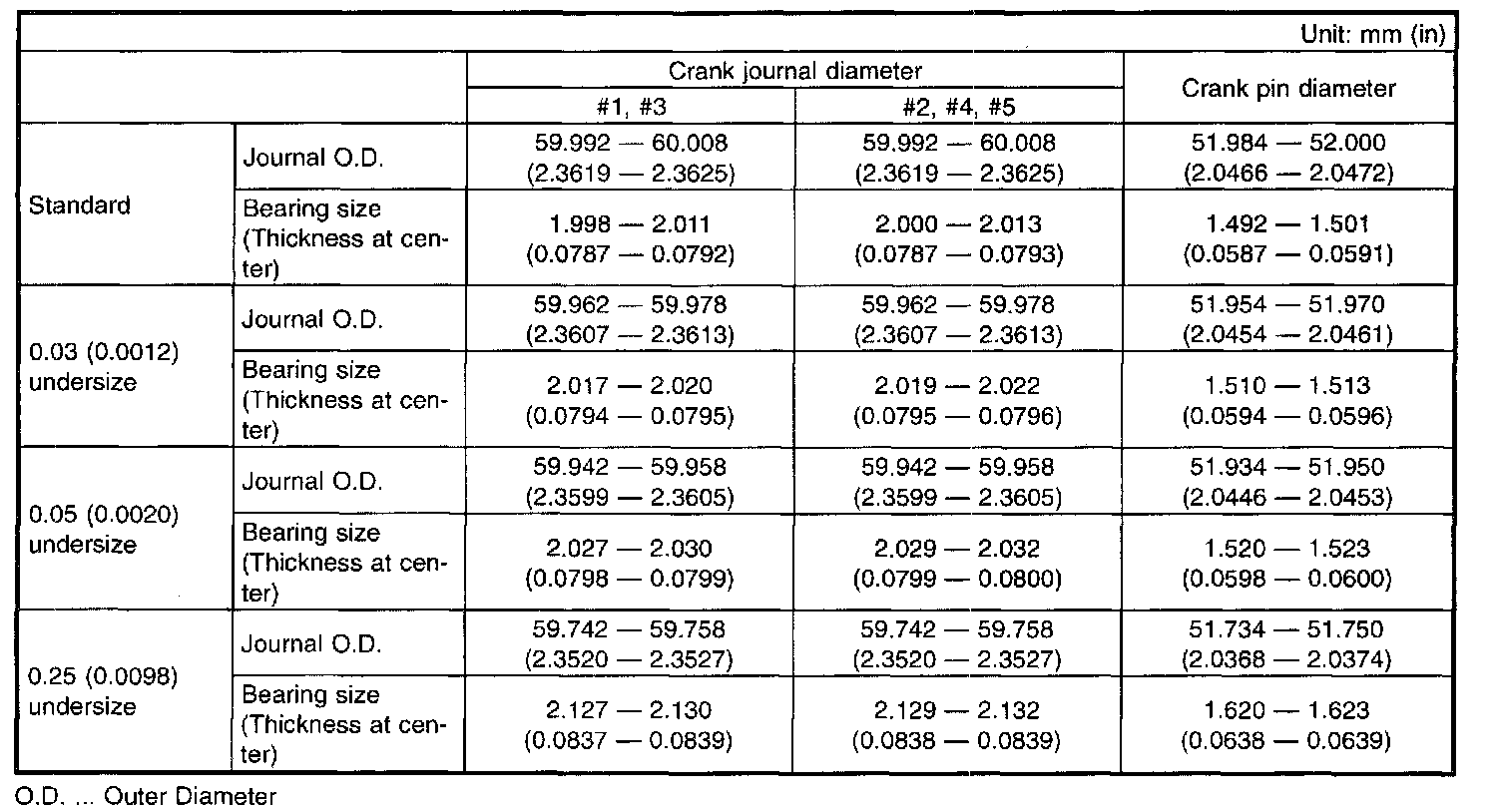 c) Inspect the crank journal and crank pin for wear. If they are not within the specifications, replace bearing with a suitable (undersize) one, and replace or recondition crankshaft as necessary. When grinding crank journal or crank pin, finish them to the specified dimensions according to the undersize bearing to be used.