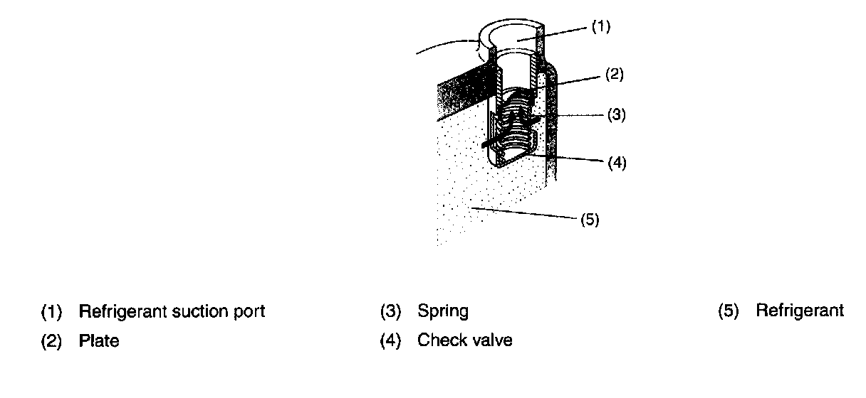 A check valve consisting of a spherical plate and spring is provided at the suction port of the rear head. Immediately after the compressor has stopped, there is large difference between the high- and low-pressures. This would cause reverse rotation of the compressor and consequent reverse flow of refrigerant to the evaporator if no check valve is provided. Immediately after the compressor has stopped, the high-pressure refrigerant forces the check valve plate upward and closes the suction port to prevent flow of refrigerant from the high-pressure side to the low-pressure side.