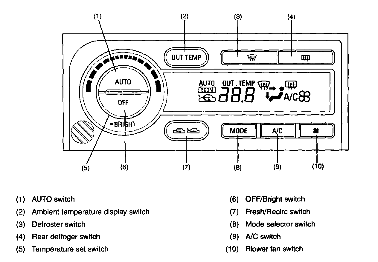 - AUTO switch: When this switch is pressed (ON), the air outlet selection, blower fan speed, air temperature, fresh/recirculation switching, and compressor operation are automatically controlled. When the AUTO switch is pressed second time, the compressor operates in the ECON mode. In the ECON mode, the ECM controls compressor operation based on inputs from the intake air temperature sensor. Compressor operating time in the ECON mode is shorter than in the AUTO mode.
