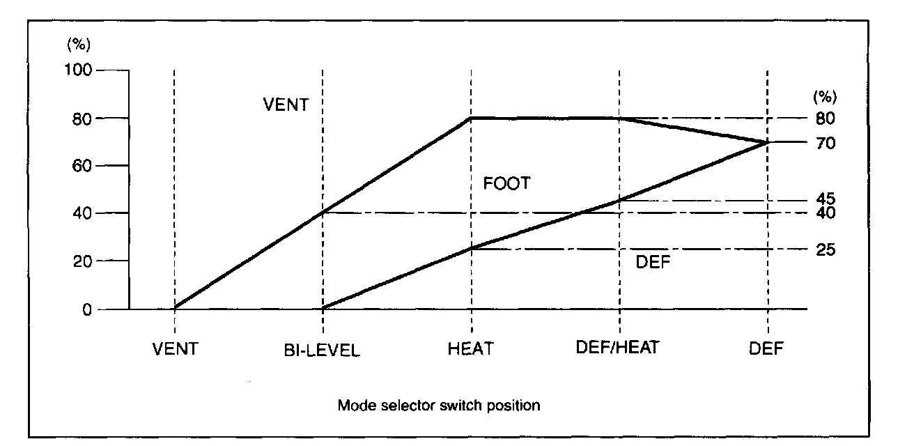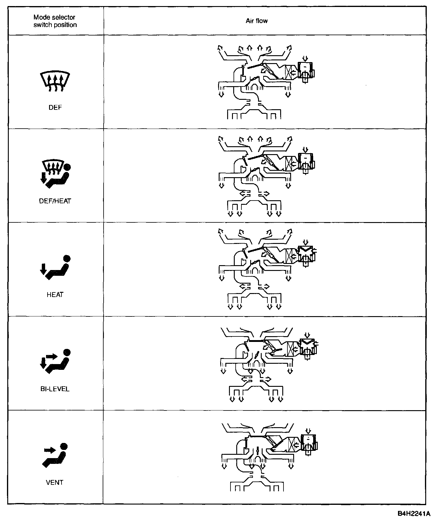 The diagram shows air distribution for each position of the mode selector switch.