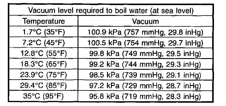- The list shows the vacuum values necessary to boil water in various temperature. In addition, the vacuum levels indicated on the gauge are approx. 3.3 kPa (25 mmHg, 0.98 inHg) lower than those measured at 304.8 m (1,000 ft) above sea level.