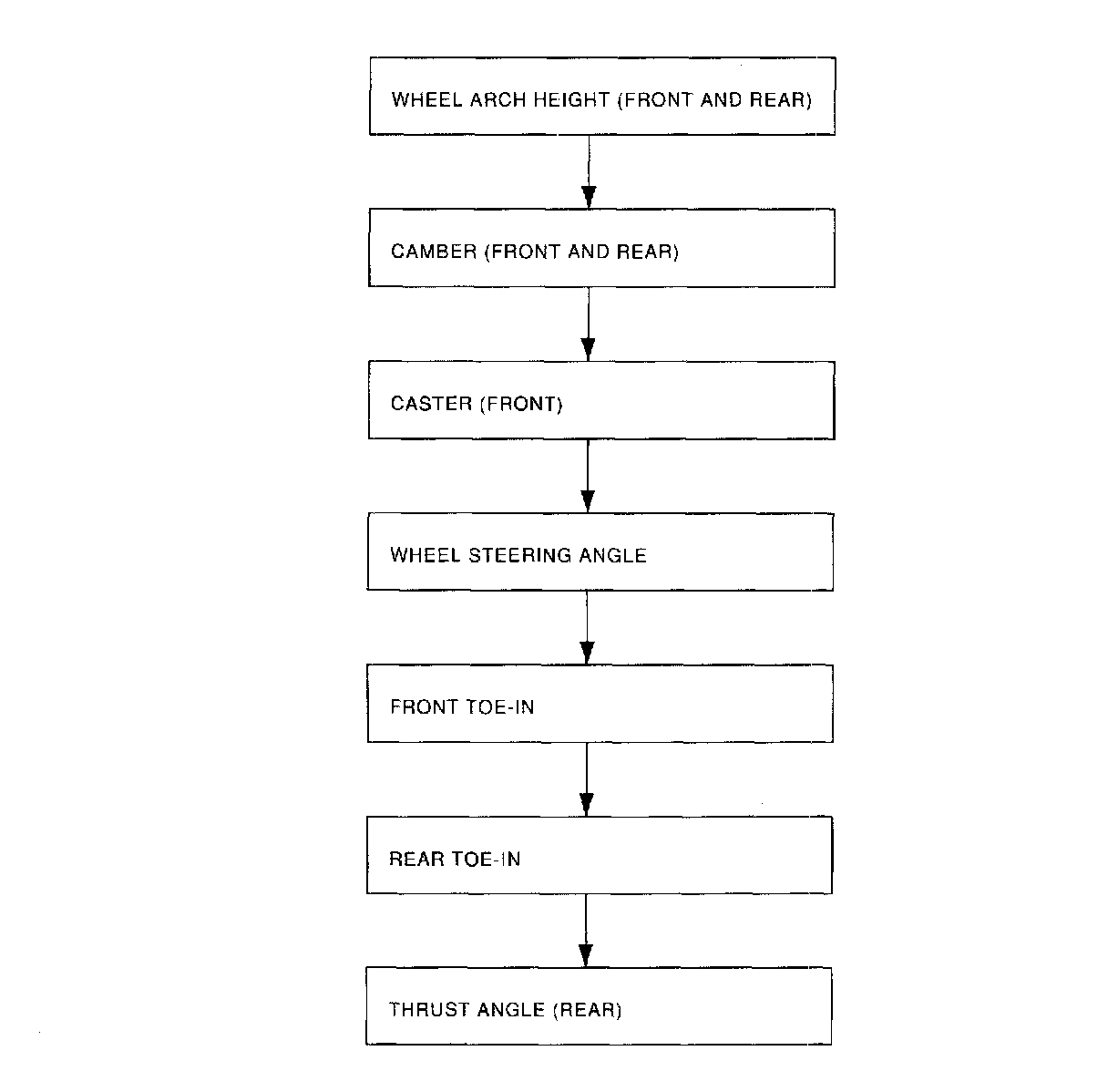 Check, adjust and/or measure wheel alignment in accordance with procedures indicated in figure: