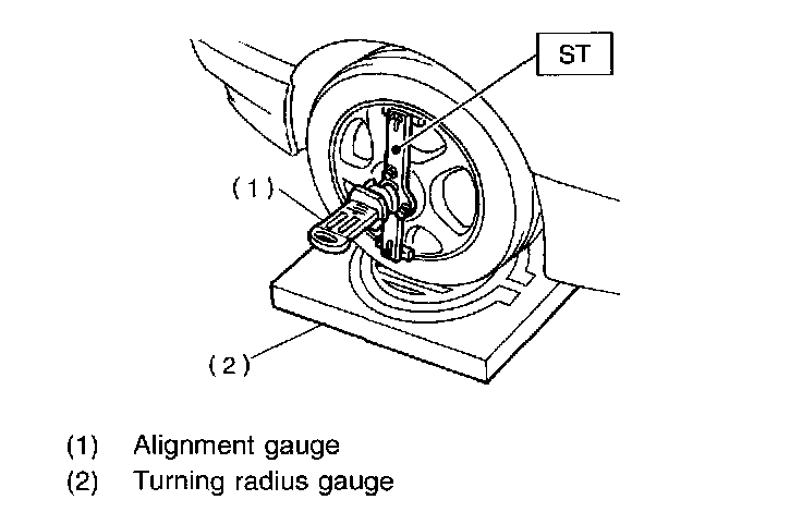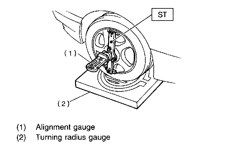 1. Place front wheel on turning radius gauge. Make sure ground contacting surfaces of front and rear wheels are set at the same height.
