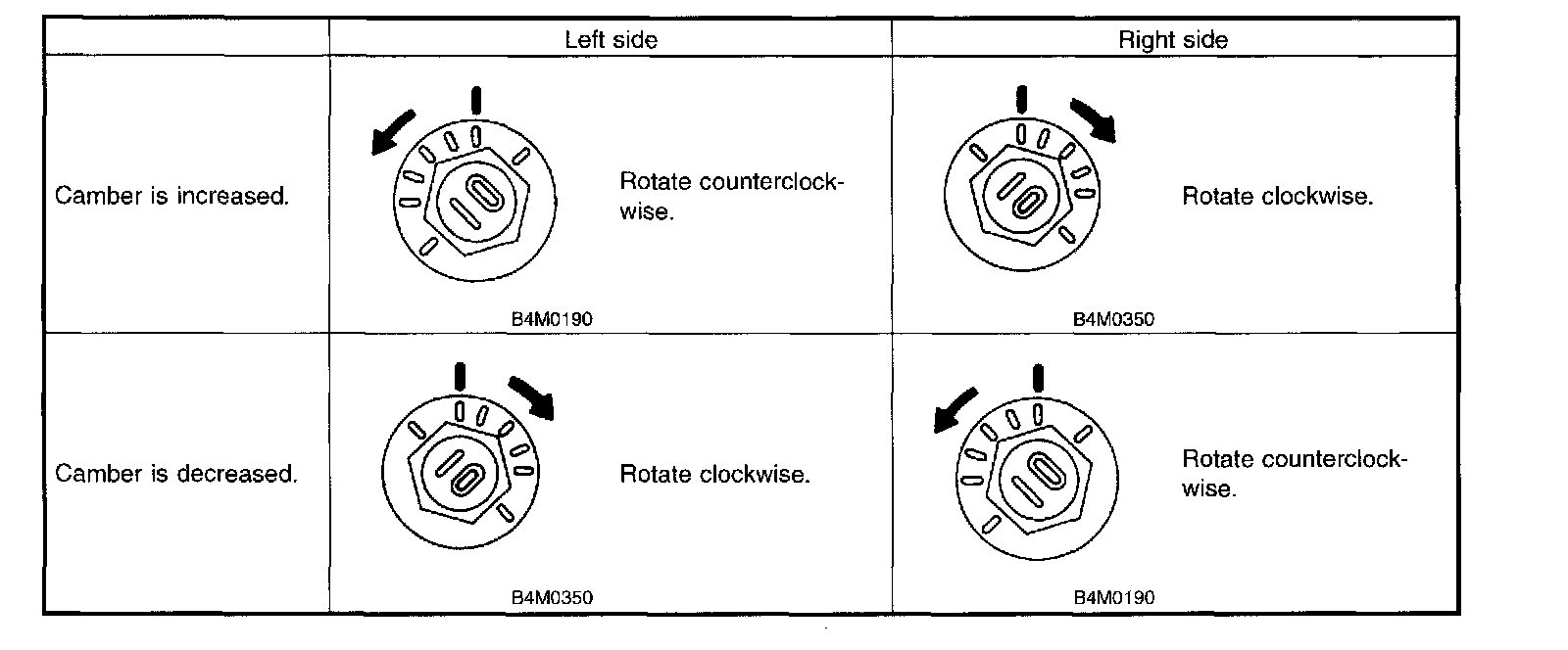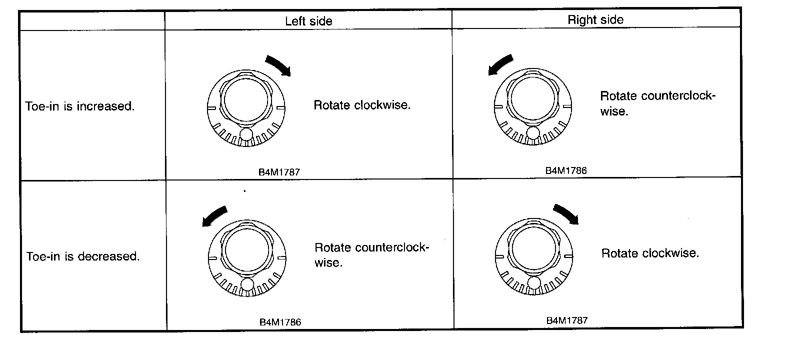 2. When one rear wheel is adjusted in a toe-in direction, adjust the other rear wheel equally in toe-out direction, in order to make thrust angle adjustment.