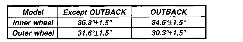 2. While depressing brake pedal, turn steering wheel fully to the left and right. With steering wheel held at each fully turned position, measure both the inner and outer wheel steering angle.