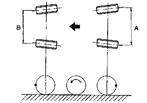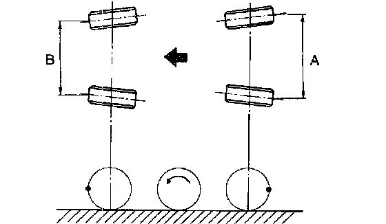 4. Measure distance "B" between left and right marks. Toe-in can then be obtained by the following equation: A - B = Toe-in