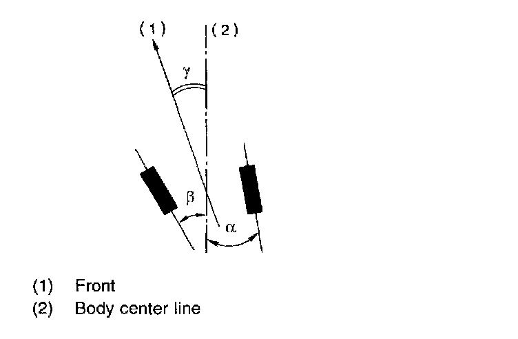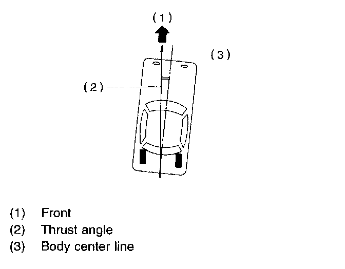 NOTE: Thrust angle refers to a mean value of left and right rear wheel toe angles in relation to vehicle body center line. Vehicle is driven straight in the thrust angle direction while swinging in the oblique direction depending on the degree of the mean thrust angle.