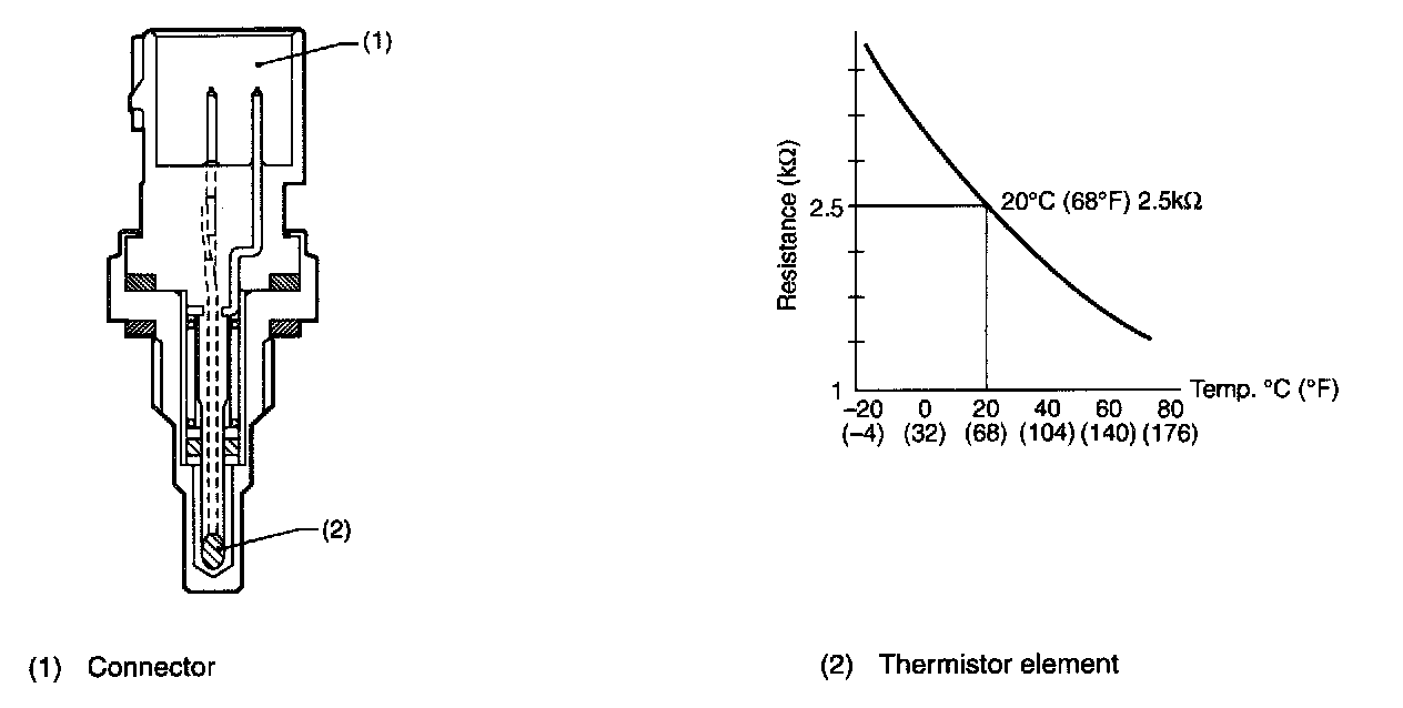 The engine coolant temperature sensor is located on the engine coolant pipe. The sensor uses a thermistor whose resistance changes inversely with temperature. Resistance signals as engine coolant temperature information are transmitted to the ECM to make fuel injection, ignition timing, purge control solenoid valve and other controls.