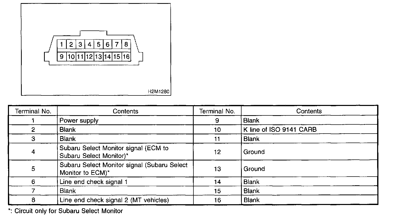 1. This connector is used both for OBD-II general scan tools and the Subaru Select Monitor.