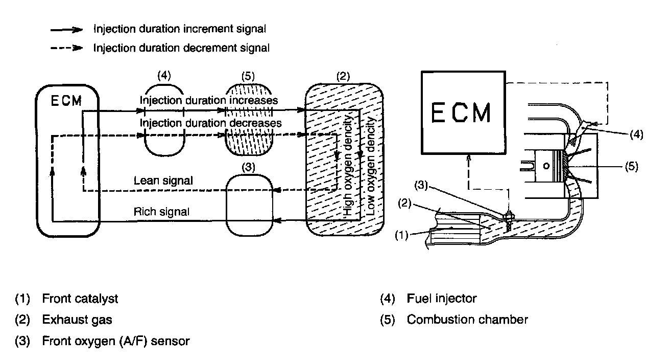 - In the air-fuel ratio feedback control, the ECM calculates the necessary amount of correction based on data from the oxygen sensor and adds the result to the basic duration (which is stored in the ECM's memory for each condition defined by the engine speed and various loads.)