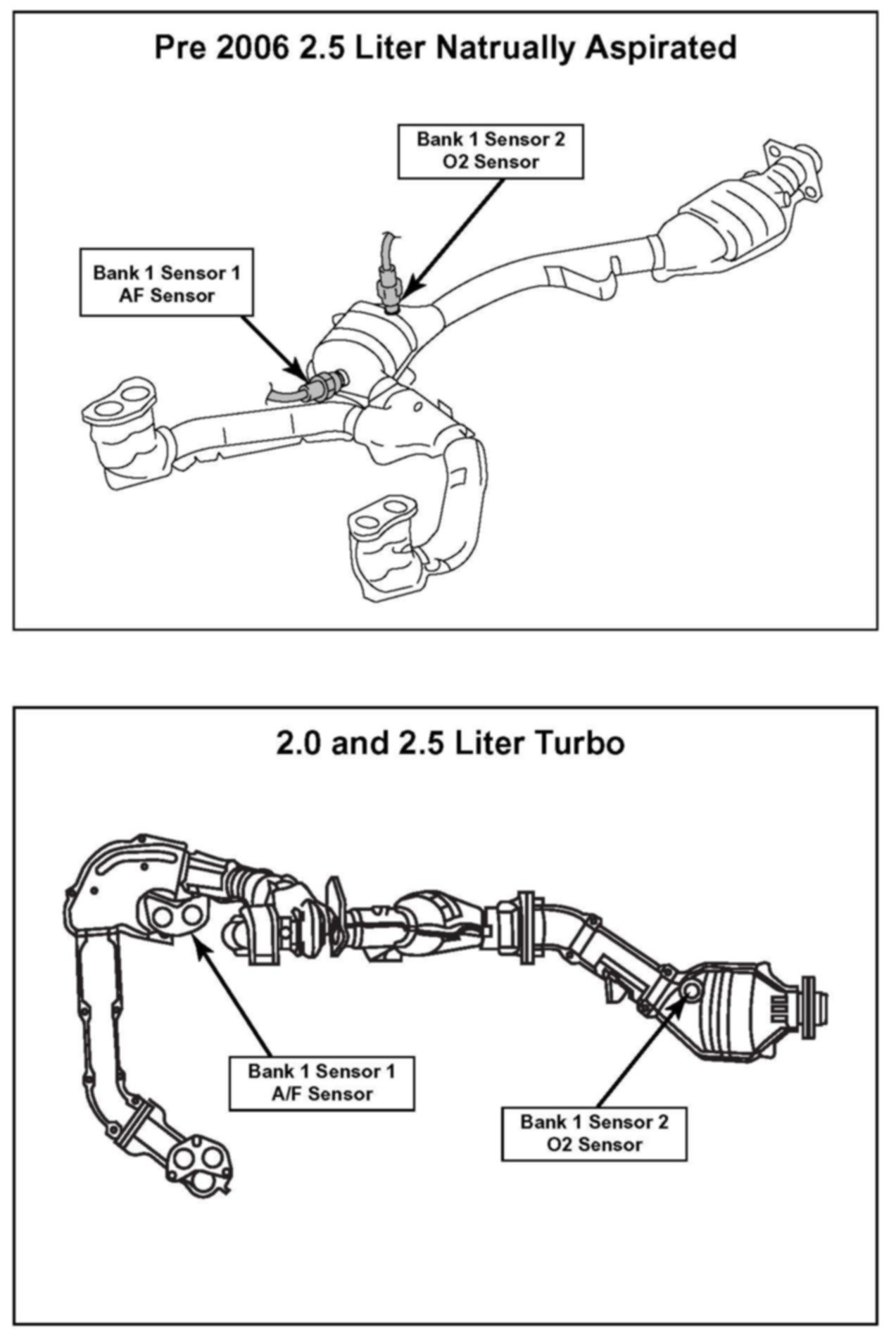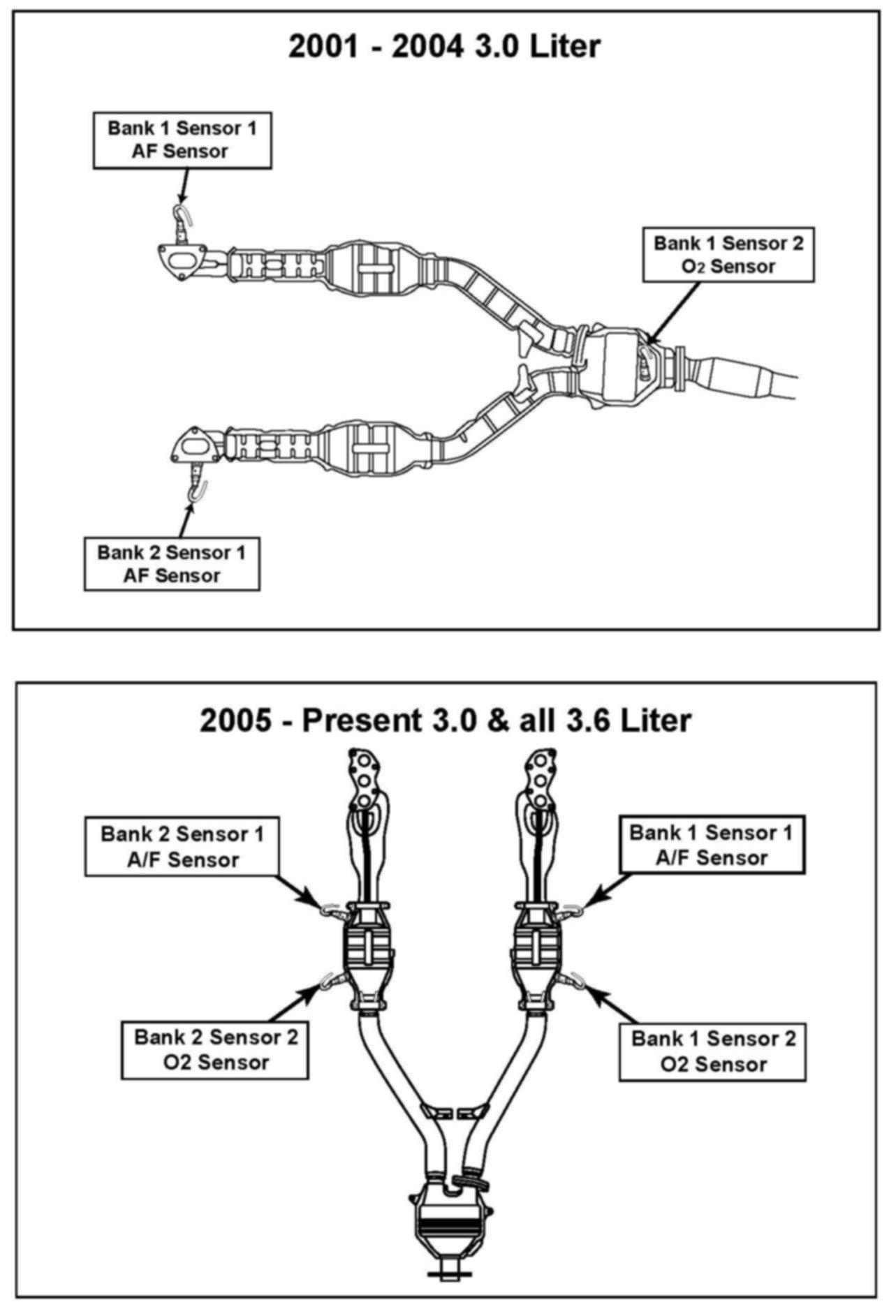 When performing diagnostics or reading Diagnostic Trouble Codes (DTC) for Air Fuel Ratio (A/F) sensors and Oxygen (O2) sensors use the following information to identify, locate and repair the appropriate sensor and sensor circuits: