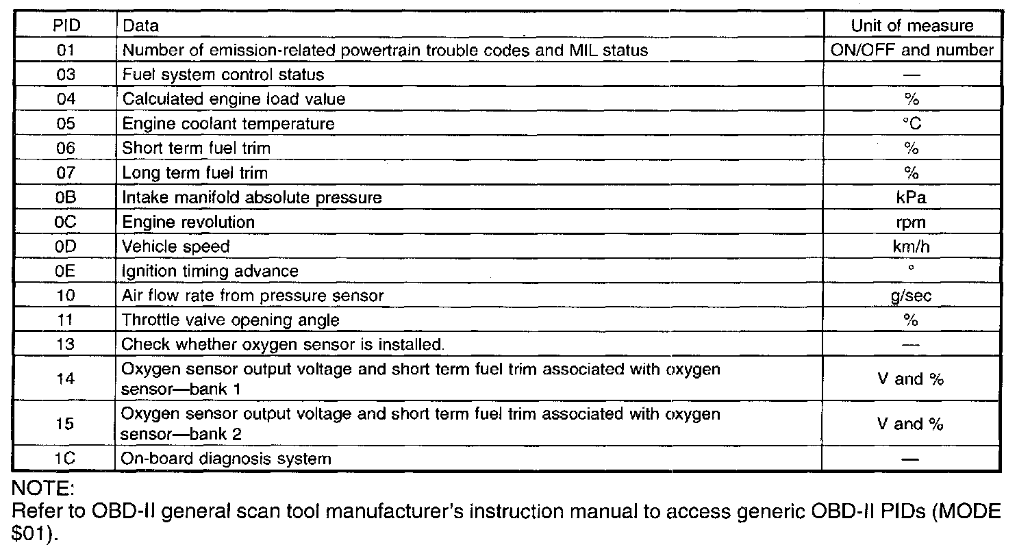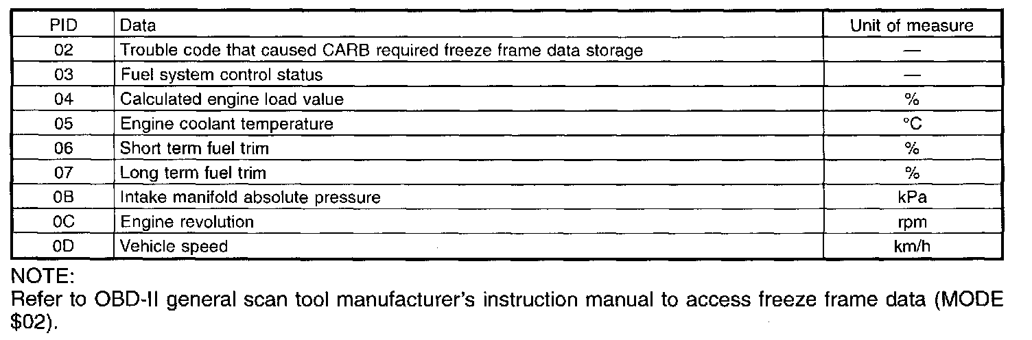 Refers to data denoting the operating condition when trouble is sensed by the on-board diagnosis system. A list of the support data and PID (Parameter Identification) codes are shown in the above table.