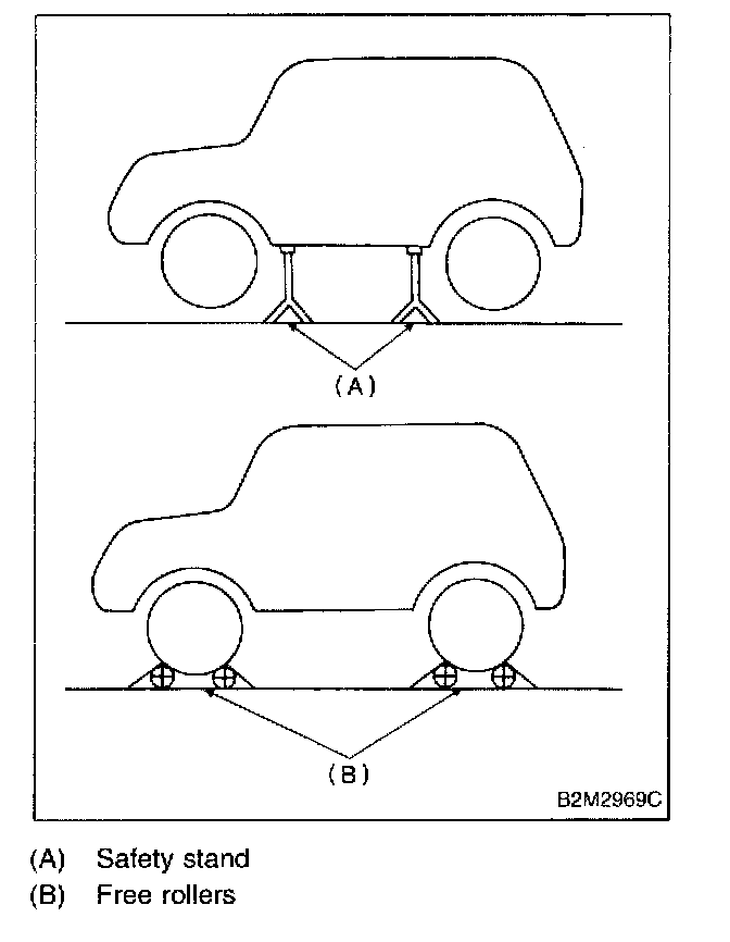- In order to prevent the vehicle from slipping due to vibration, do not place any wooden blocks or similar items between the safety stands and the vehicle.