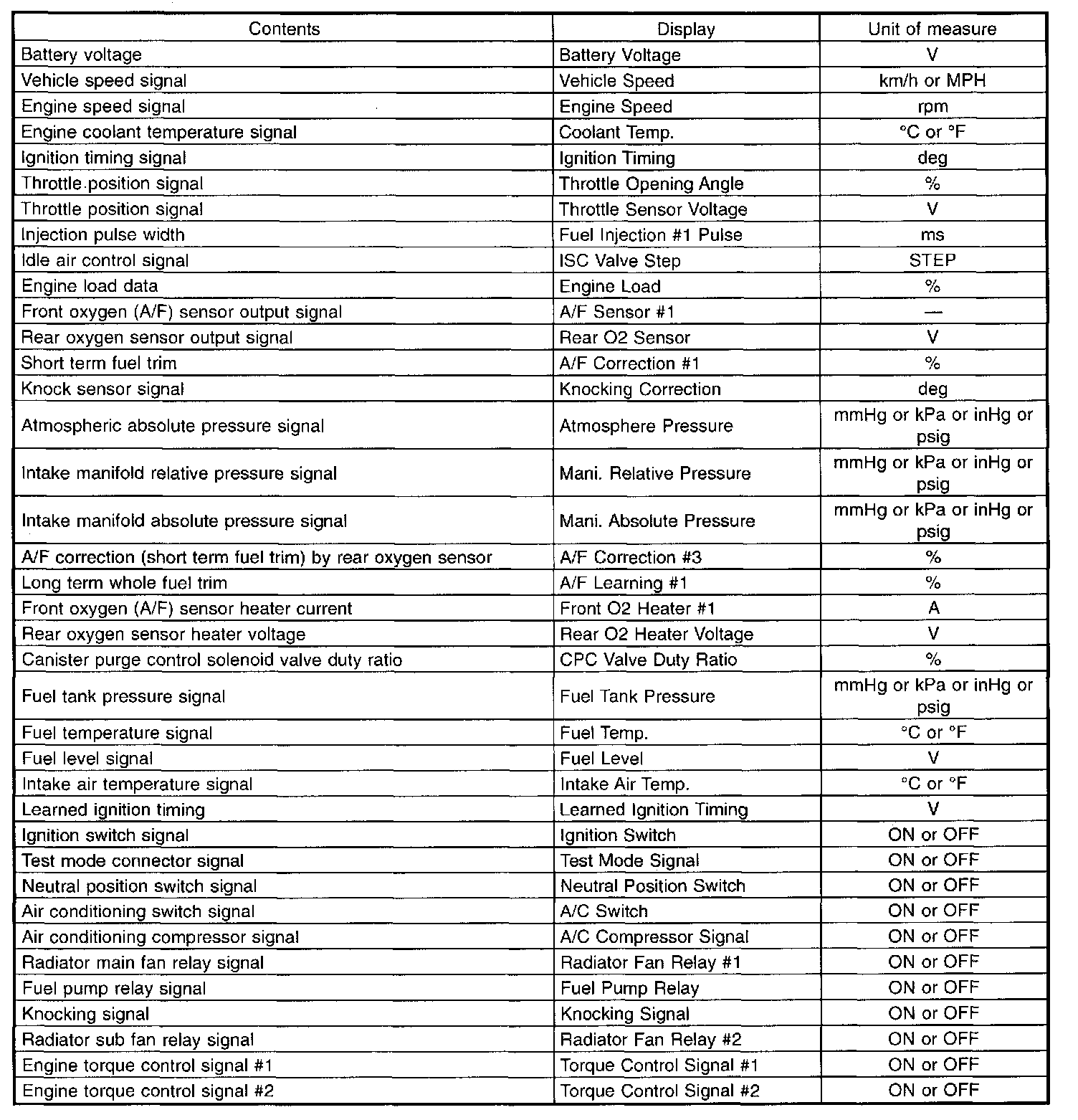 The signal which notifies whether or not torque down is possible is displayed. This signal is transmitted from the ECU in response to a torque down signal from the TCU. When torque down is prohibited, ON is displayed. When permitted, OFF is displayed.