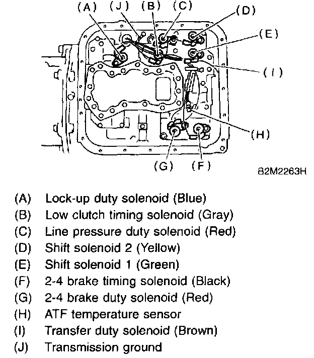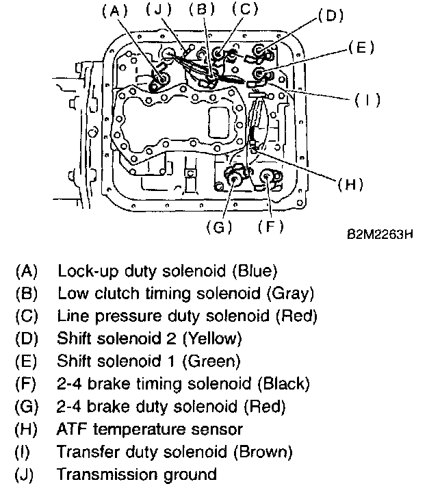 15. Disconnect the harness connectors for the solenoids, duty solenoids, ATF temperature sensor and the ground cord.
