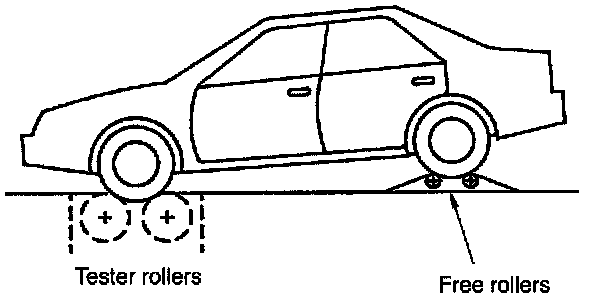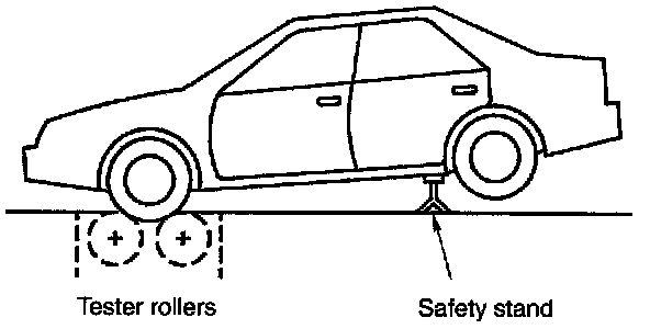 1. Position Vehicle so that front wheels are placed between rollers of test machine.