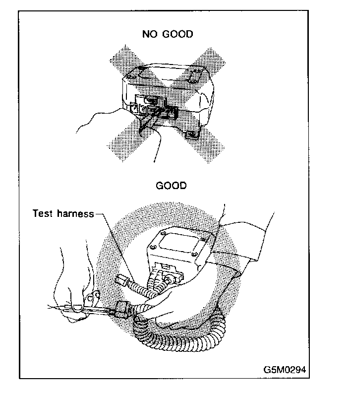 When checking, use a test harness. Do not directly apply the tester probe to any connector terminal of the airbag.