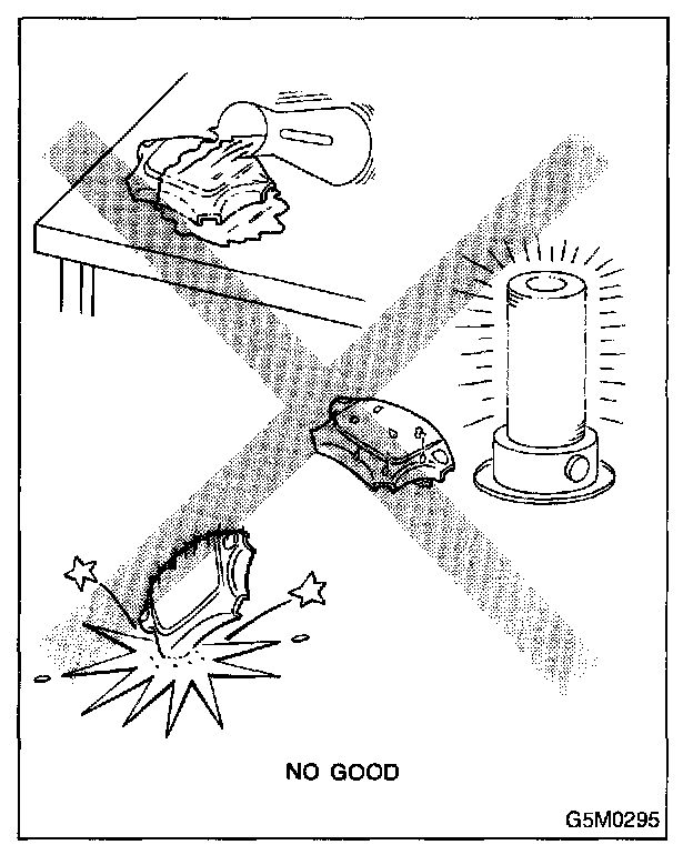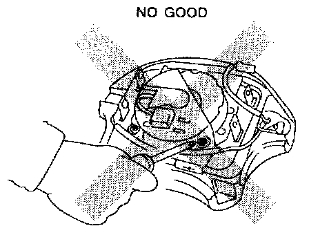 When storing a removed airbag module, do not place any objects on it or pile airbag modules on top of each other. If the airbag inflates for some reason when it is placed with its pad side facing downward or under any object, a serious accident may result.
