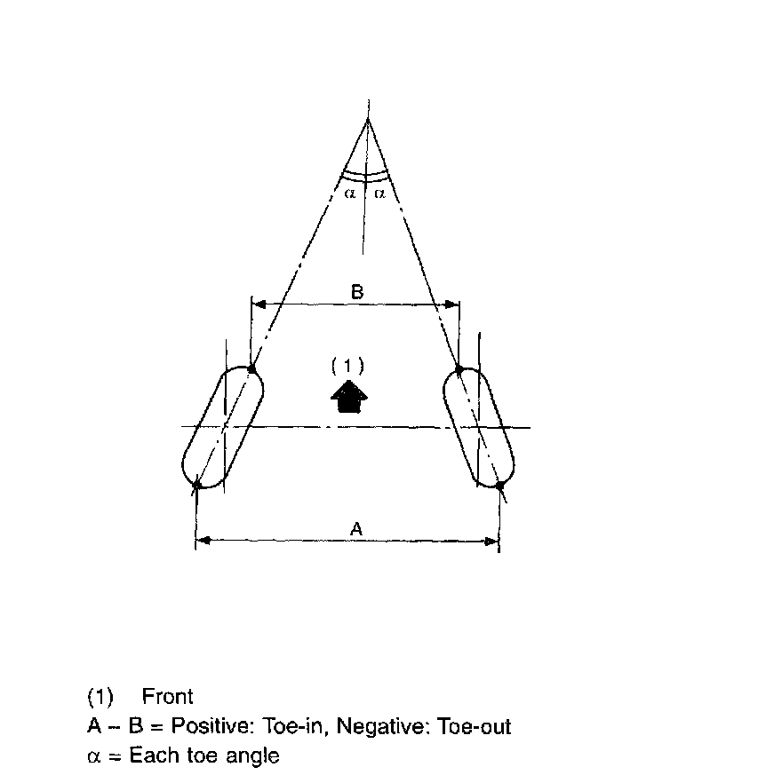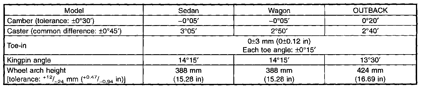 ^ Front and rear toe-ins and front camber can be adjusted. If toe-in or camber tolerance exceeds specifications, adjust toe-in and camber to the middle value of specification.
