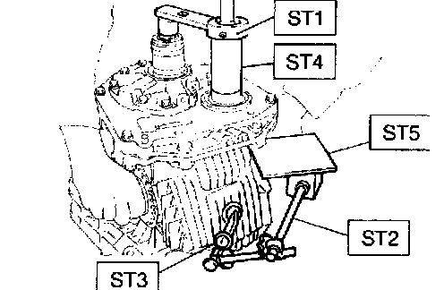 7. Turn the drive pinion several rotations with ST1 and check to see if the backlash is within the standard value with ST2, ST3, ST4 and ST5.