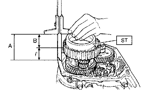 3. Measure the height "e" from mating surface of the transmission case to end surface of the center differential clutch drum with ST.