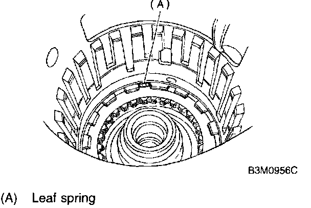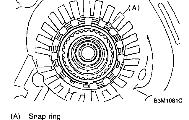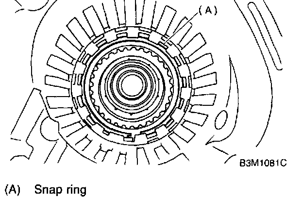4. Installation of the low & reverse brake: Install dish plate, driven plates, drive plates, and a retaining plate, and secure with a snap ring.