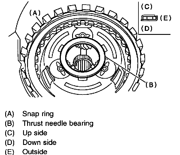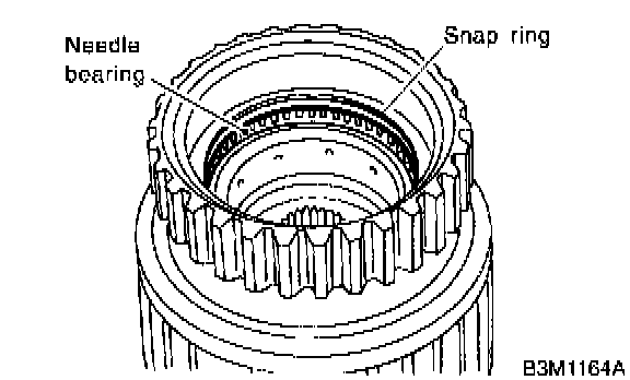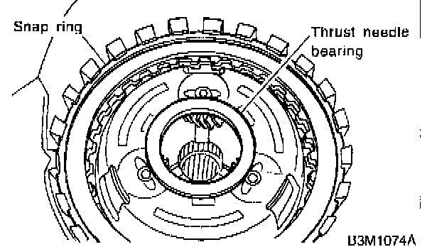 15. Remove snap ring and thrust needle bearing.