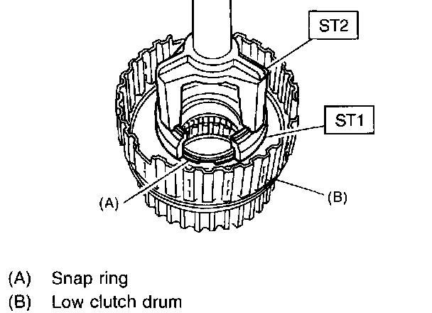 7. Compress the spring retainer, and remove the snap ring from the low clutch drum, by using ST1 and ST2.