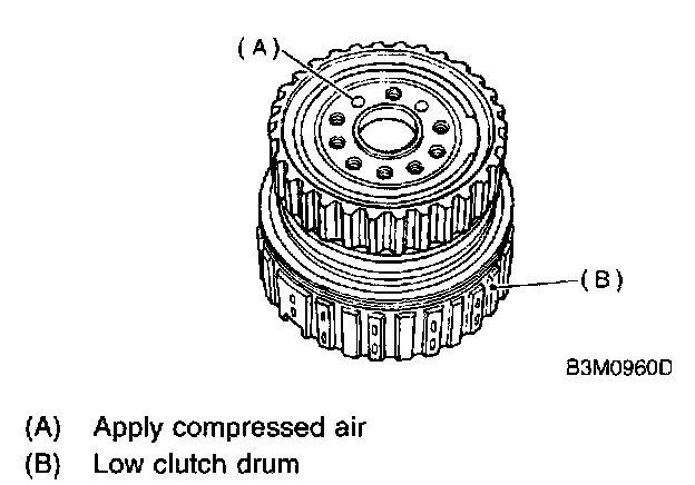 Install the one-way clutch inner race to the low clutch drum, and apply compressed air to remove the low clutch piston.
