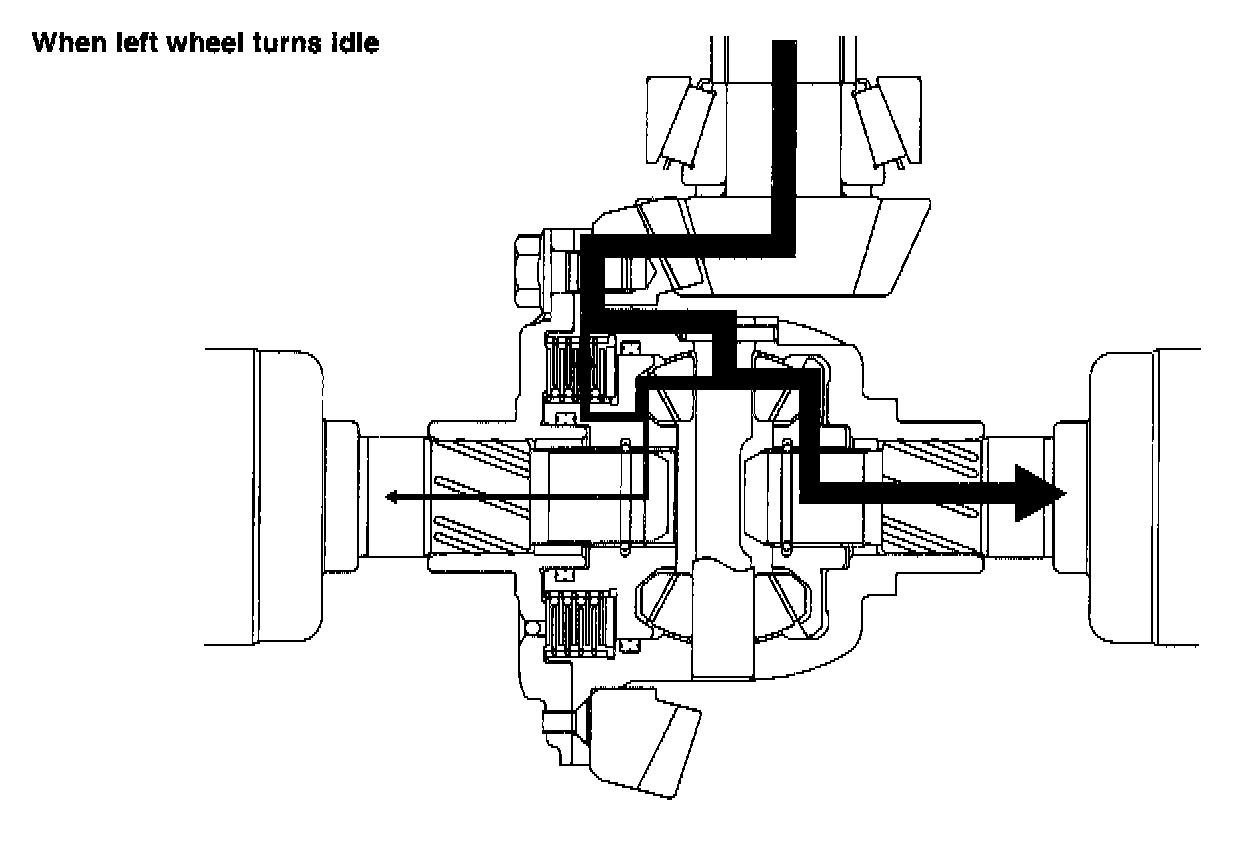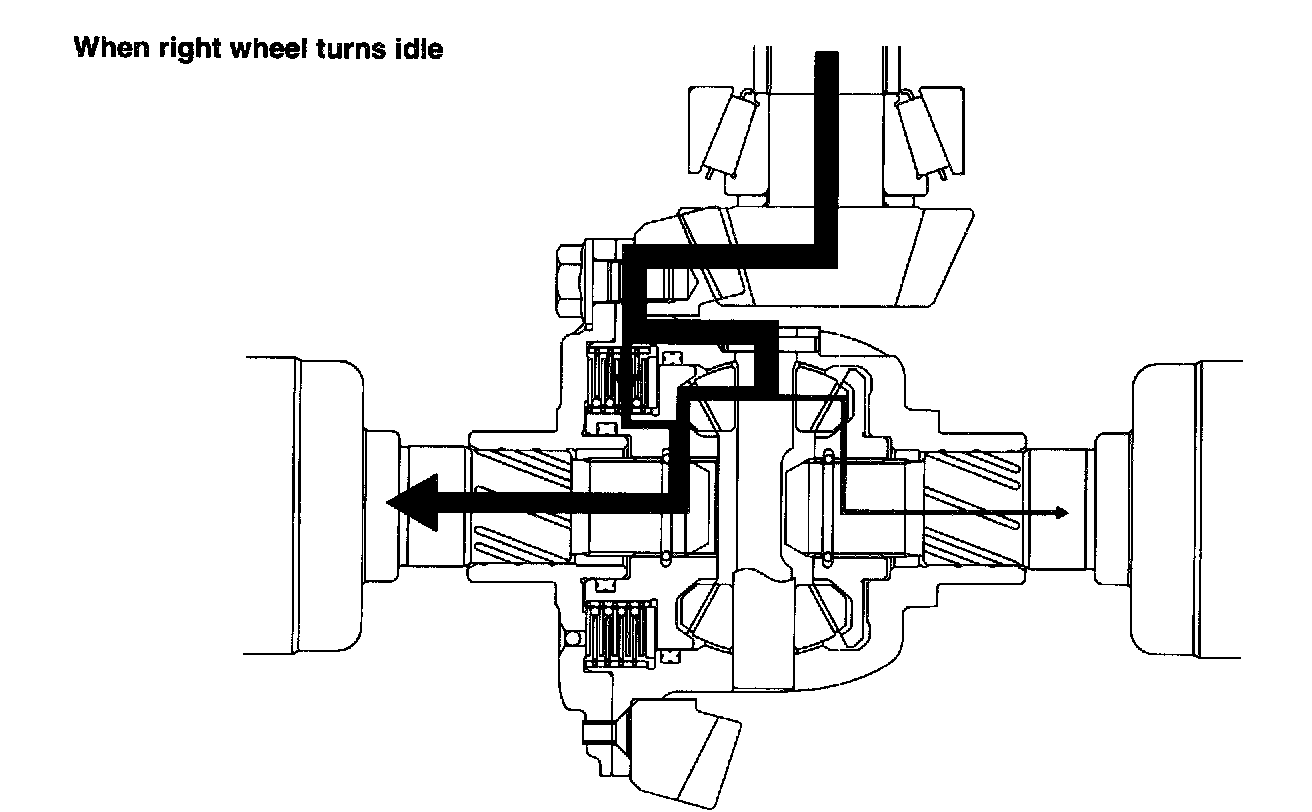 When the right wheel spins, the differential torque is transferred from the right wheel to the left wheel. Also in this case, a torque greater by the differential torque than the torque to the spinning wheel is transmitted to the wheel rotating at the lower speed.