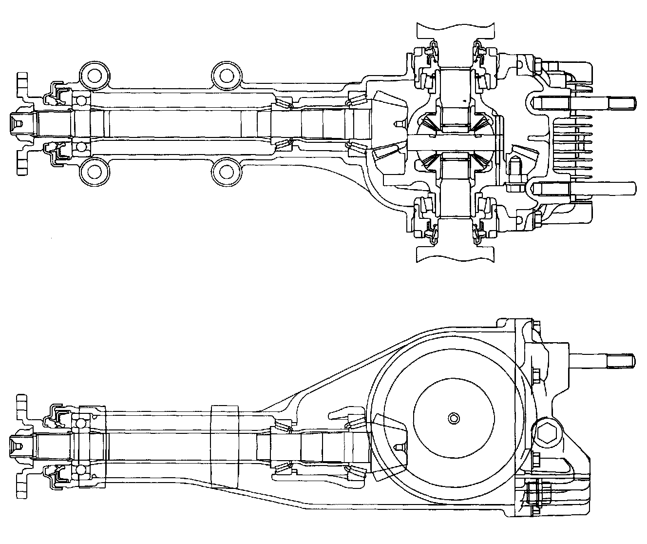 The drive gear is a hypoid gear with nominal diameter of 152 mm (5.98 inch). The drive pinion shaft is supported by three bearings. The bearing preload is adjusted by selecting a spacer and washer combination of a proper thickness. The drive pinion height is adjusted by properly selecting the thickness of the washers located at the drive pinion neck using Dummy Shaft and Gauge.