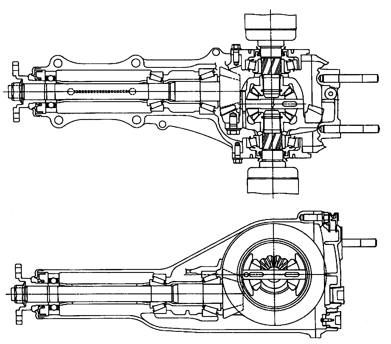 The drive gear is a hypoid gear with a nominal diameter of 160 mm (6.30 inch). The drive pinion shaft is supported by three bearings. The bearing preload is adjusted by selecting a spacer and washer combination of a proper thickness. The drive pinion height is adjusted by properly selecting the thickness of the washers located at the drive pinion neck using Dummy Shaft and Gauge.