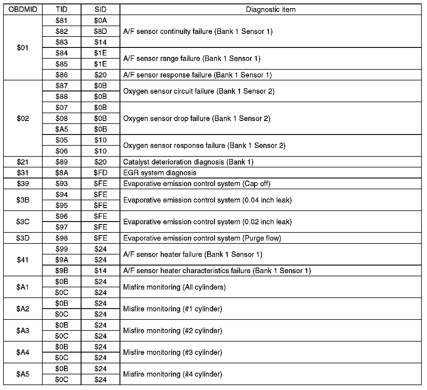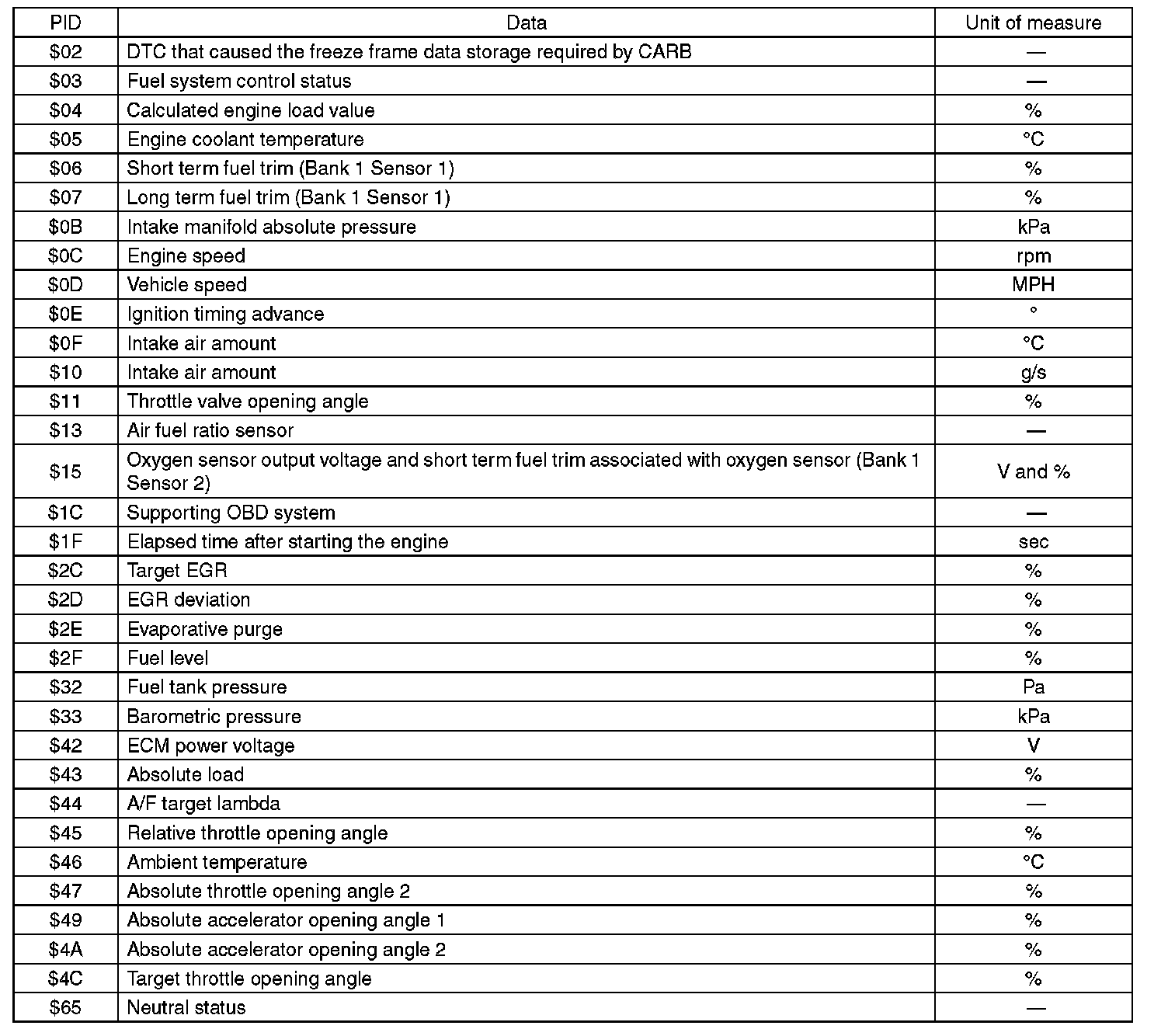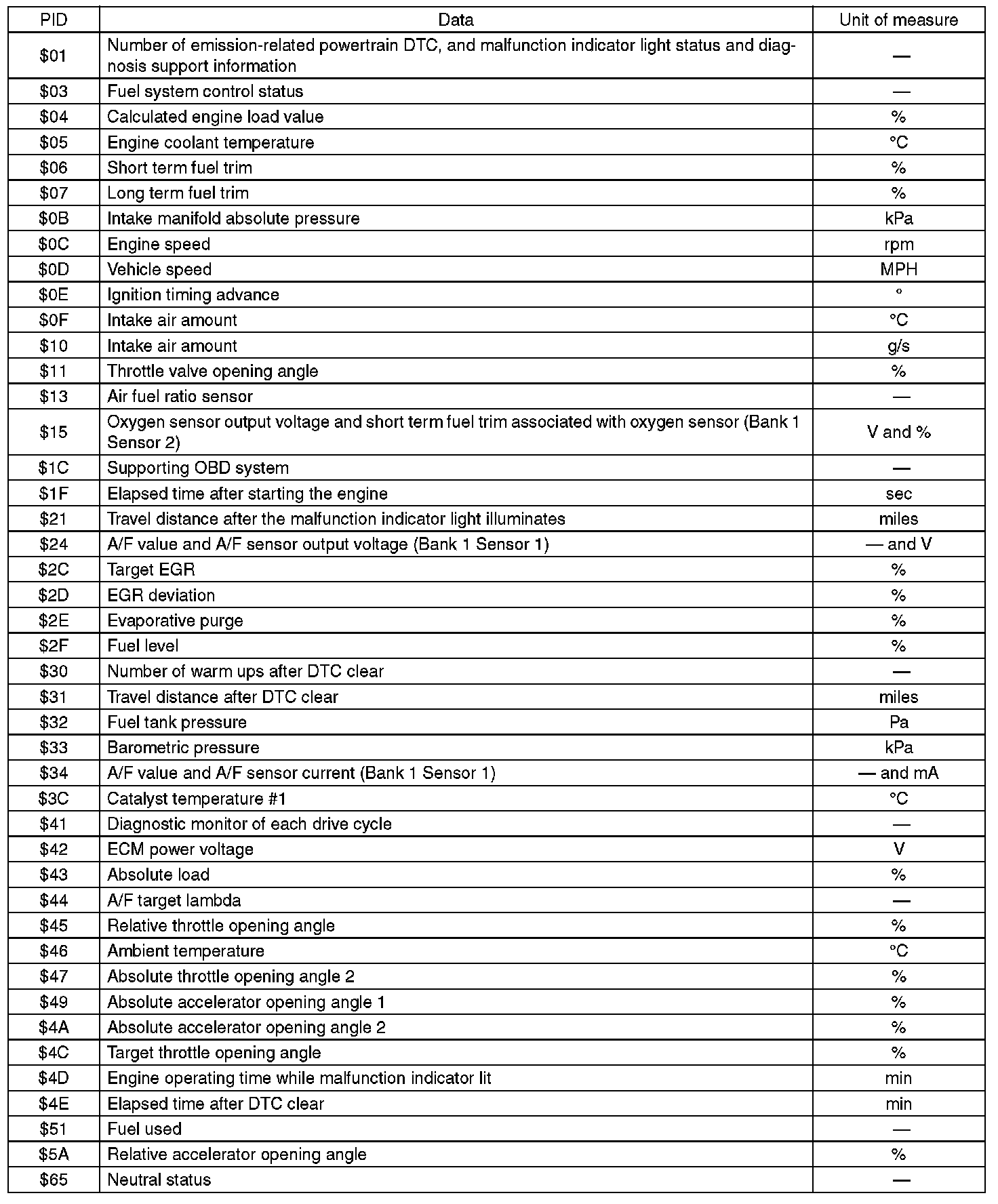 A list of the support data and PID (Parameter Identification) codes are shown in the following table.