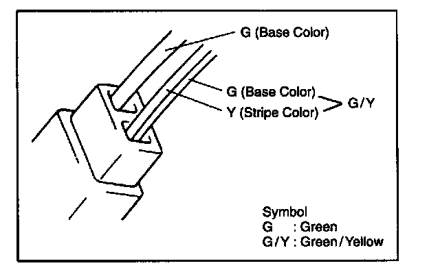 There are two types of wire color: one-color type and 2-color type (with a stripe). In case of 2-color type, the first alphabet ("G" of the example in the figure at the left) represents the basic color (color of wire insulation) and the next alphabet ("Y" of the example) represents the color of stripe.