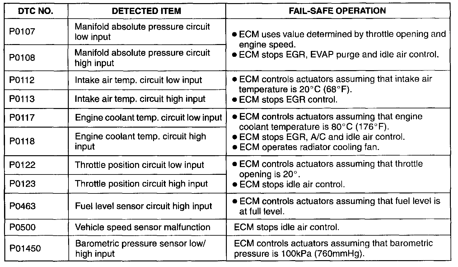 When any of the following DTCs is detected, ECM enters fail-safe mode as long as malfunction continues to exist but that mode is canceled when ECM detects normal condition after that.