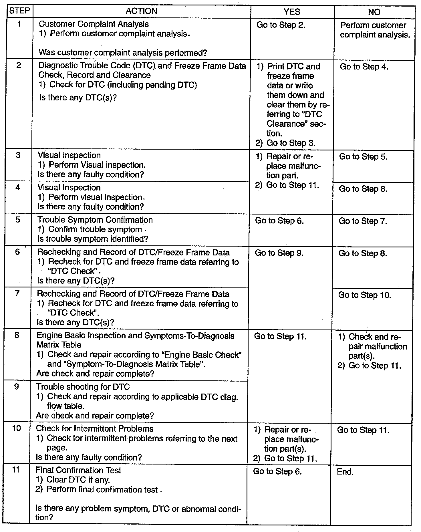 Perform basic engine check according to the "Engine Basic Inspection Flow Table" first. When the end of the flow table has been reached, check the parts of the system suspected as a possible cause referring to SYMPTOMS -TO- DIAGNOSIS MATRIX TABLE and based on symptoms appearing on the vehicle (symptoms obtained through steps of customer complaint analysis, trouble symptom confirmation and/or basic engine check) and repair or replace faulty parts, if any.