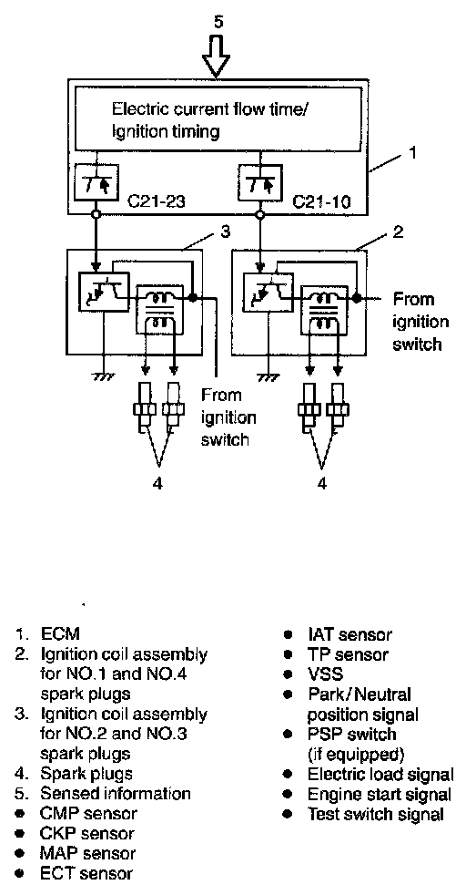 ECM judges the engine and vehicle conditions by using signals from various sensors, selects the most suitable electric current flow time and ignition timing for that engine and vehicle conditions from among those prestored in its memory and sends an ignition signal to the igniter (power unit) in ignition coil assembly.