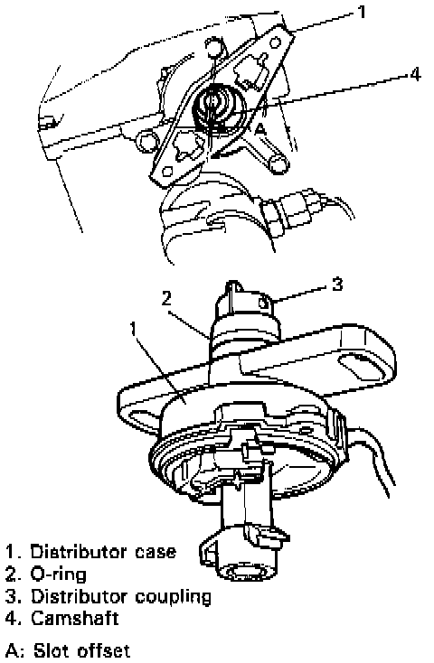 1. Install distributor without cap to camshaft. Fit the dogs of distributor coupling into the slots of camshaft when installing. The dogs of distributor coupling are offset. Therefore, if the dogs cannot engage the slots, turn the distributor shaft 180 degrees and try again.