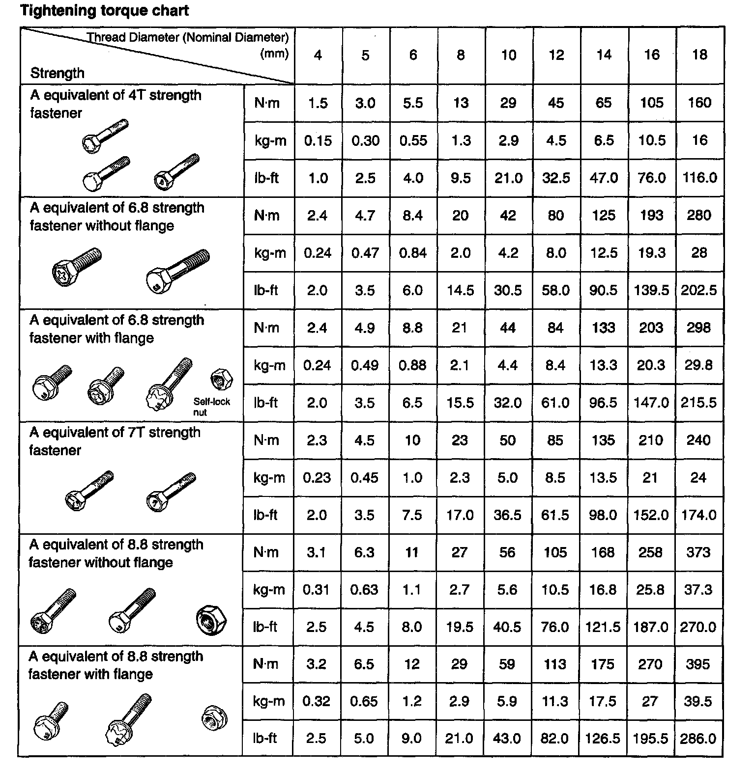- For the flanged bolt, flanged nut and self-lock nut of 4T and 7T strength, add 10% to the tightening torque given in the chart below.