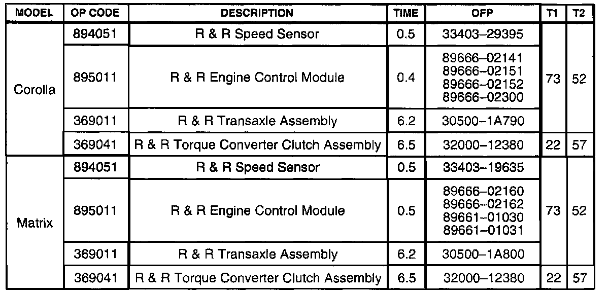 R & R of the Speed Sensor, Transaxle, and Torque Converter Clutch Assembly are covered under the Toyota Powertrain Warranty. This warranty is in effect for 60 months or 60,000 miles, whichever occurs first, from the vehicle's in-service date. R & R of the Engine Control Module is covered under the Toyota Federal Emissions Warranty. This warranty is in effect for 96 months or 80,000 miles, whichever occurs first, from the vehicle's in-service date.