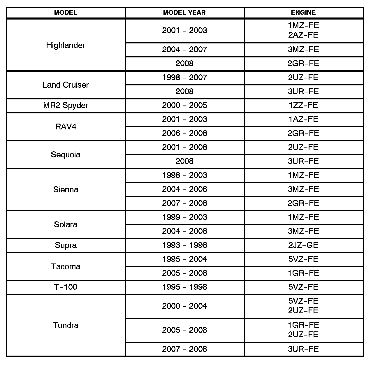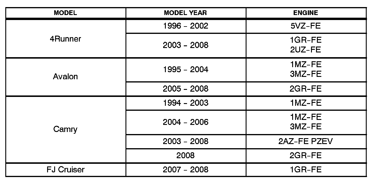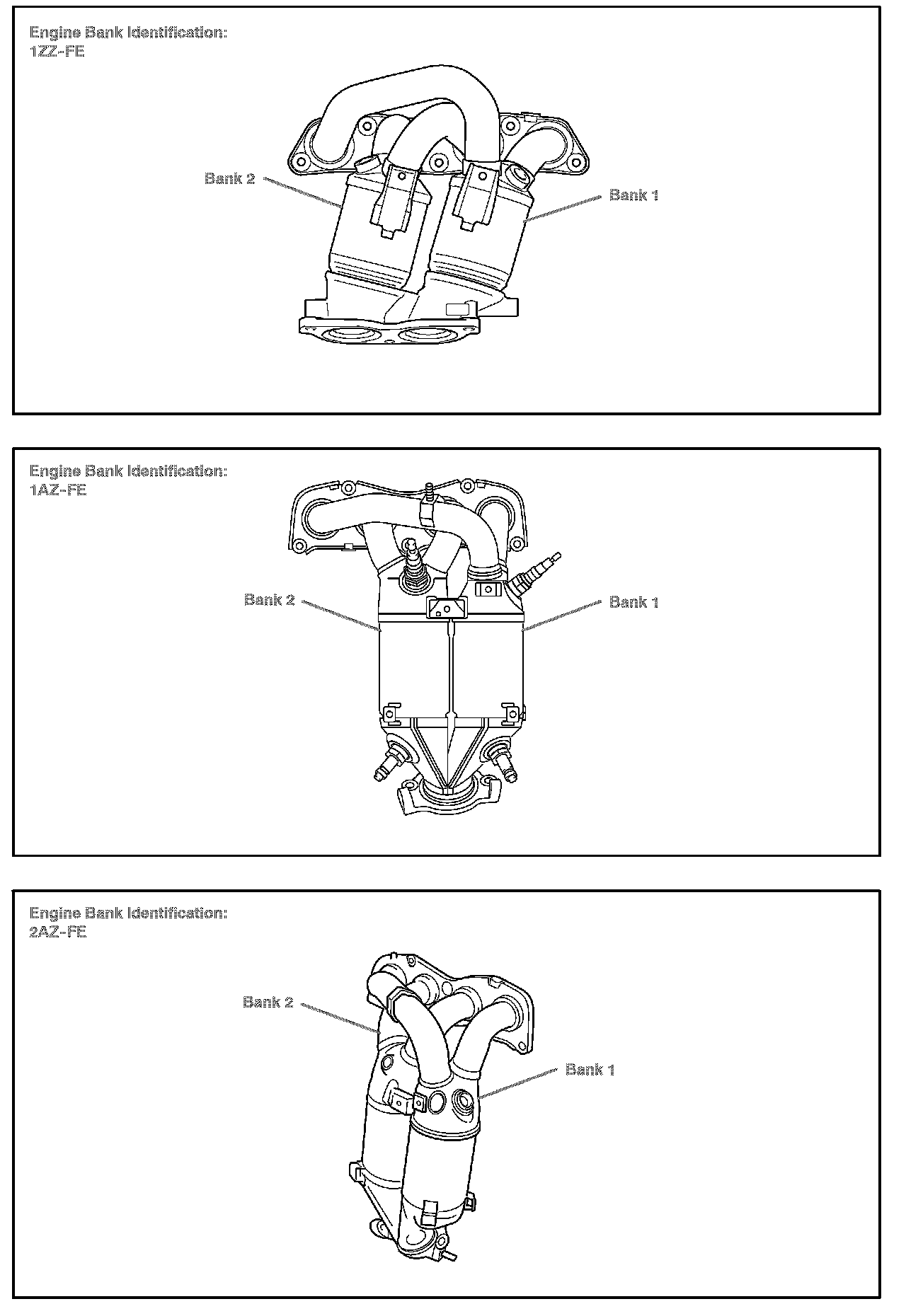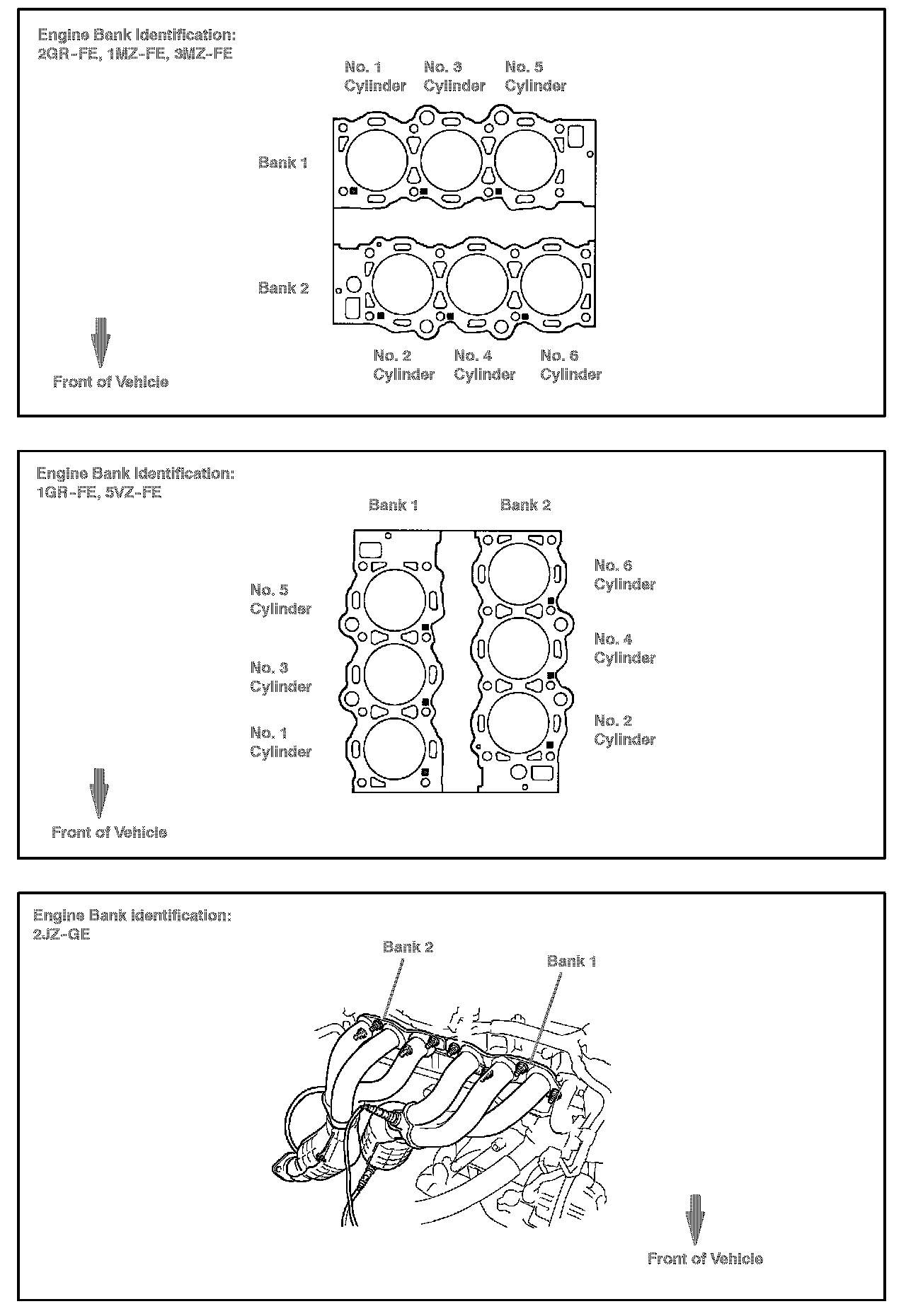 This bulletin contains information that identifies engine bank 1 and engine bank 2 on the following engines: 1AZ-FE, 2AZ-FE, 2AZ-FE (PZEV), 1GR-FE, 2GR-FE, 2GR-FSE, 2JZ-GE, 1MZ-FE, 3MZ-FE, 1UR-FSE, 3UR-FE, 2UZ-FE, 3UZ-FE, 5VZ-FE, and 1ZZ-FE.