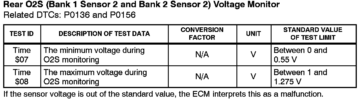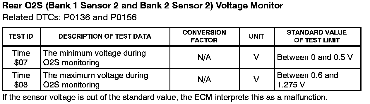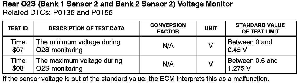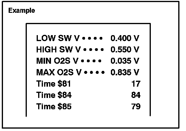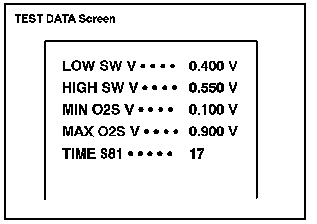 Before the O2S Monitor completes or after the ignition switch is turned OFF, the Diagnostic Tester displays the viewable upper limit or a lower limit of the test value (example: 0 V, 1.275 V, Os [seconds], 10.2s, 0 and 255).