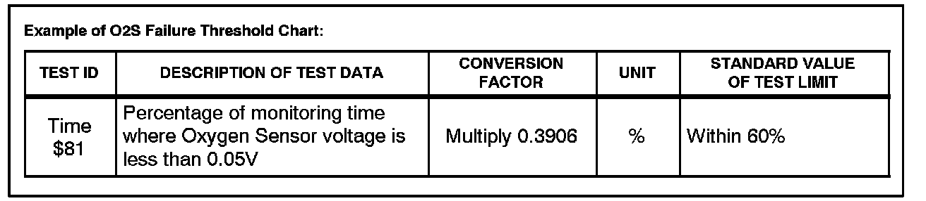 3. Compare O2S test results with the specified O2S Failure Threshold Chart. It may be necessary to convert O2S test results to a specific measurement unit using the conversion factor that is supplied in the specified table. See example.