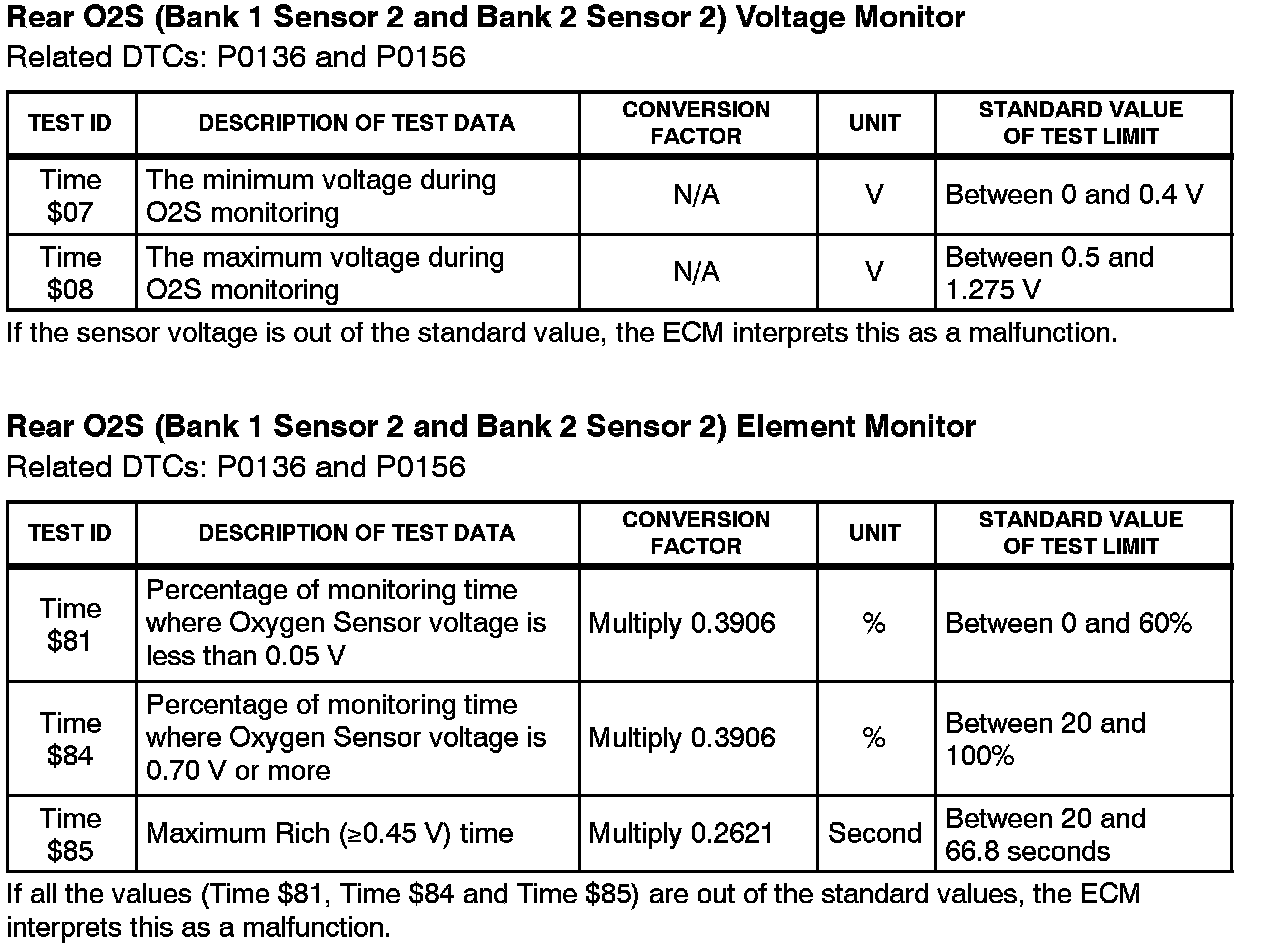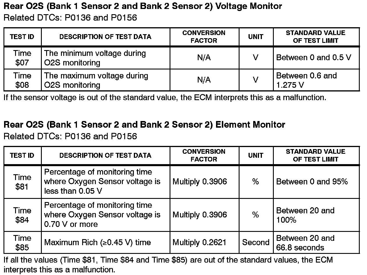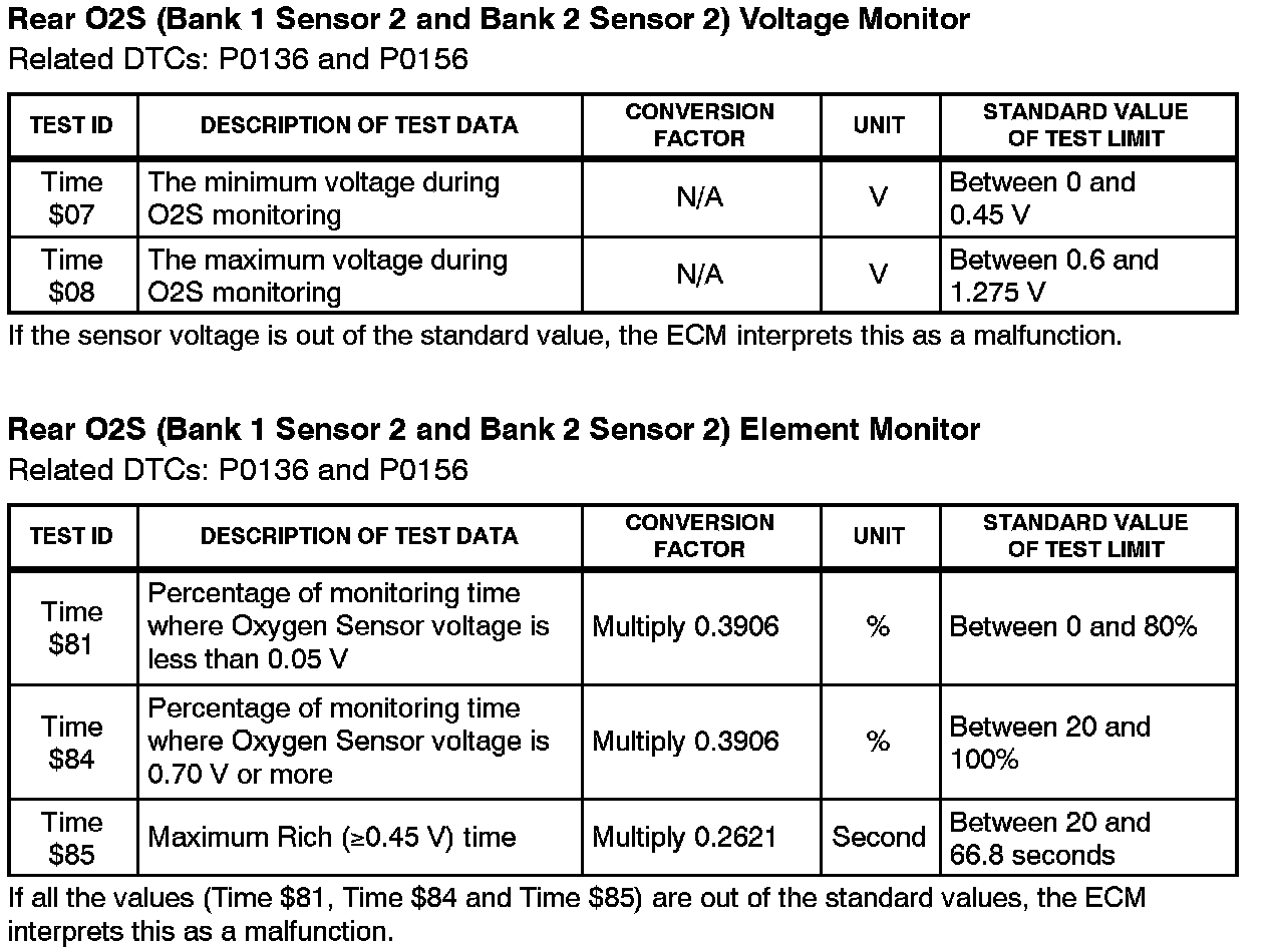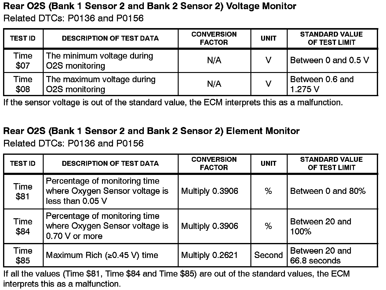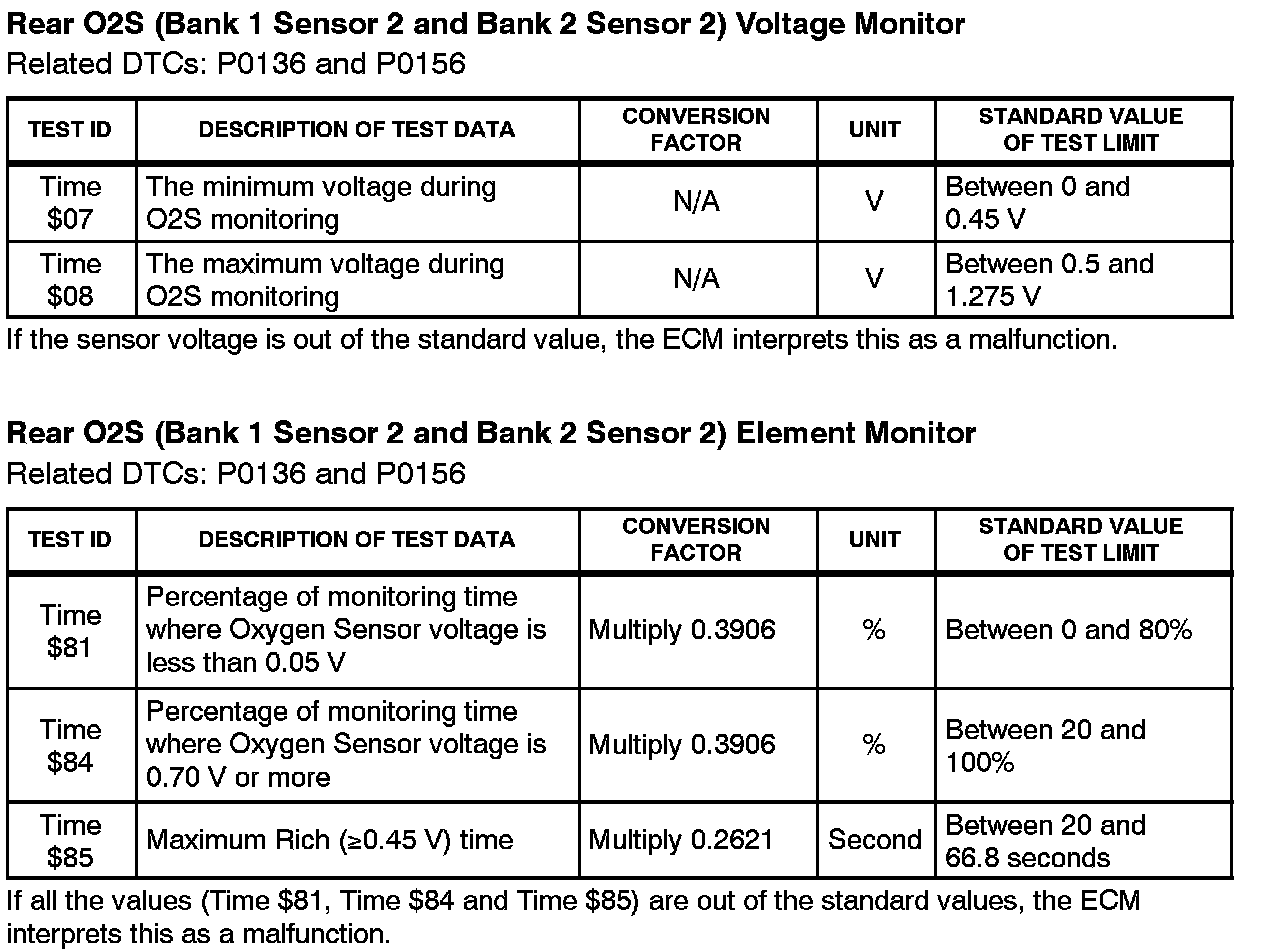 This Service Bulletin contains Oxygen Sensor (O2S) Monitor threshold values for all models from 1996 to 2003 and some 2004 models. Starting in 2004, the O2S Monitor threshold values can be found in the repair manual. These values are used when analyzing the O2S test results to determine the O2S condition.