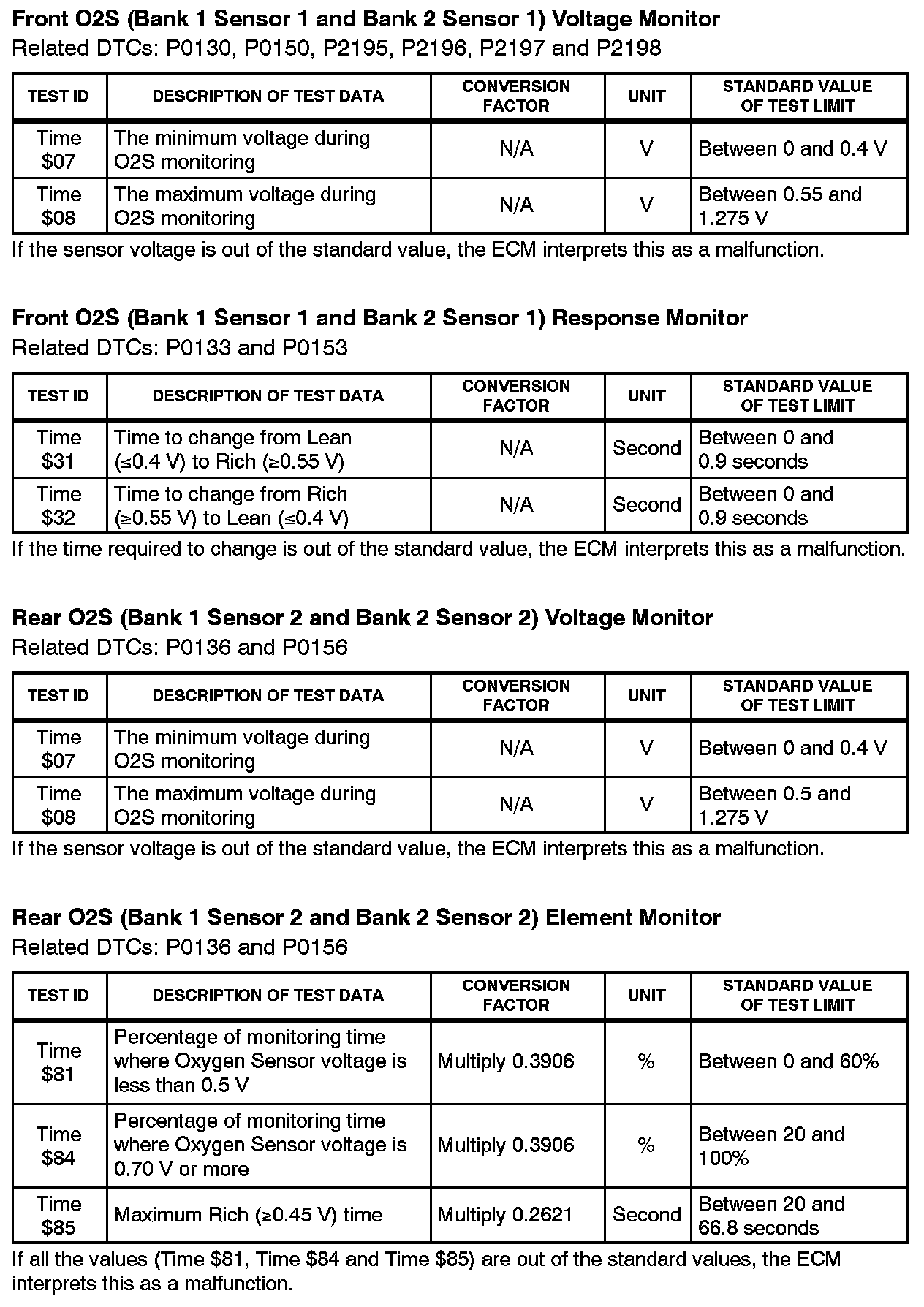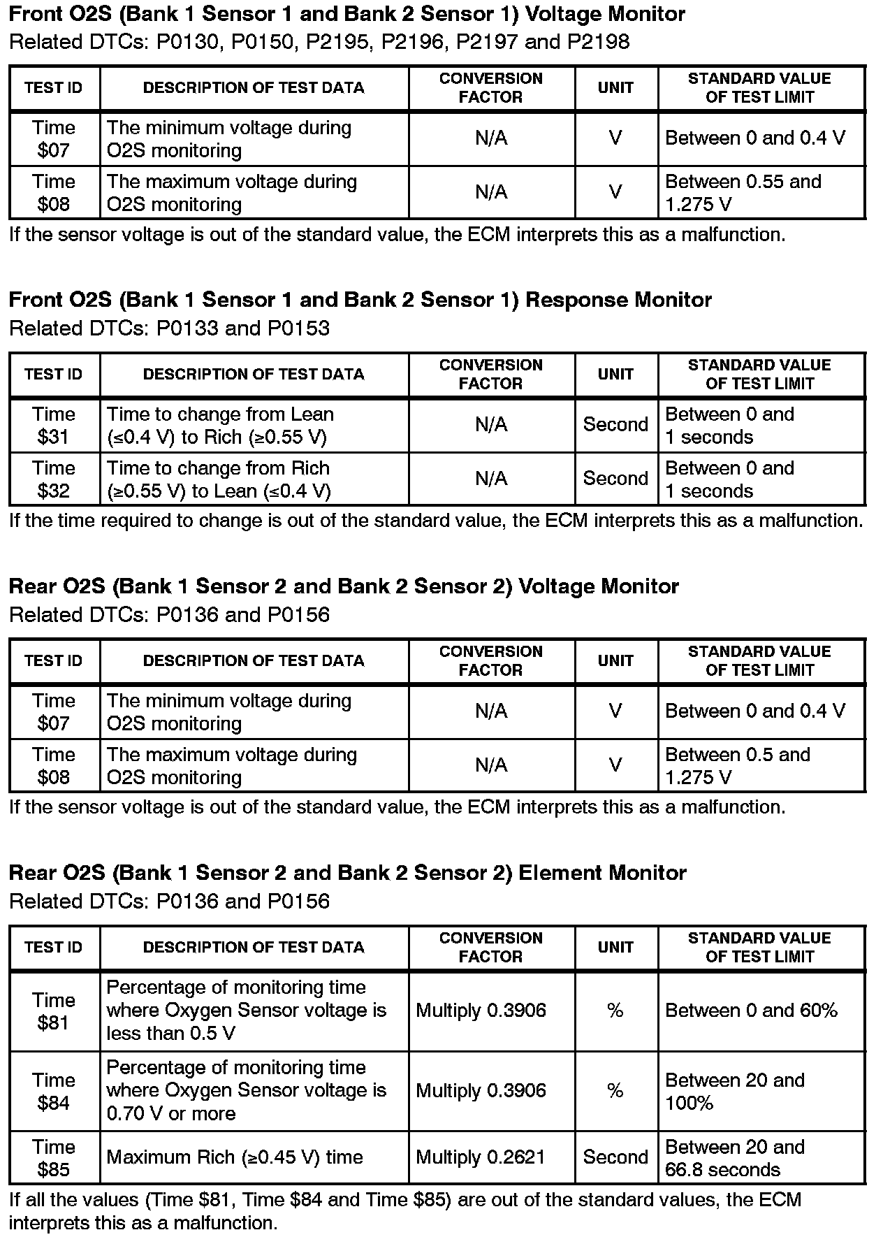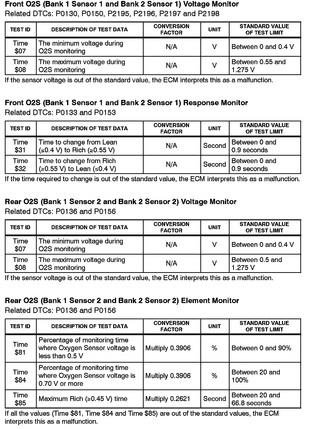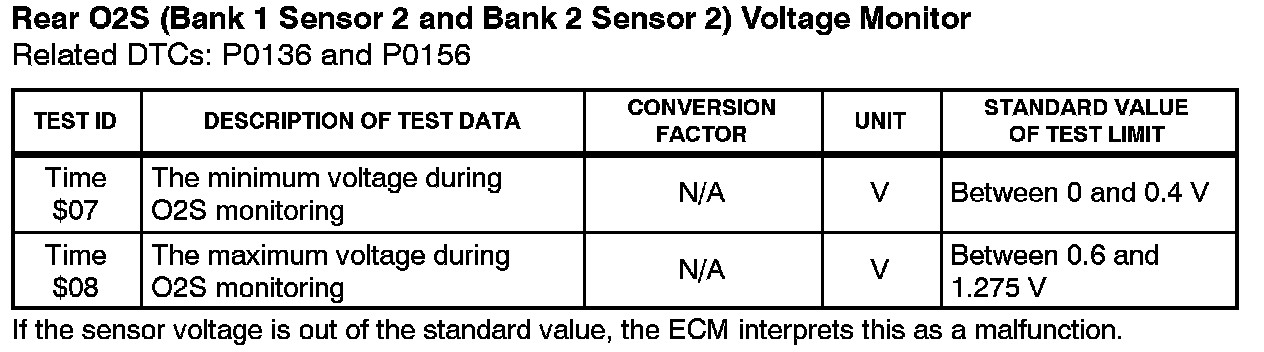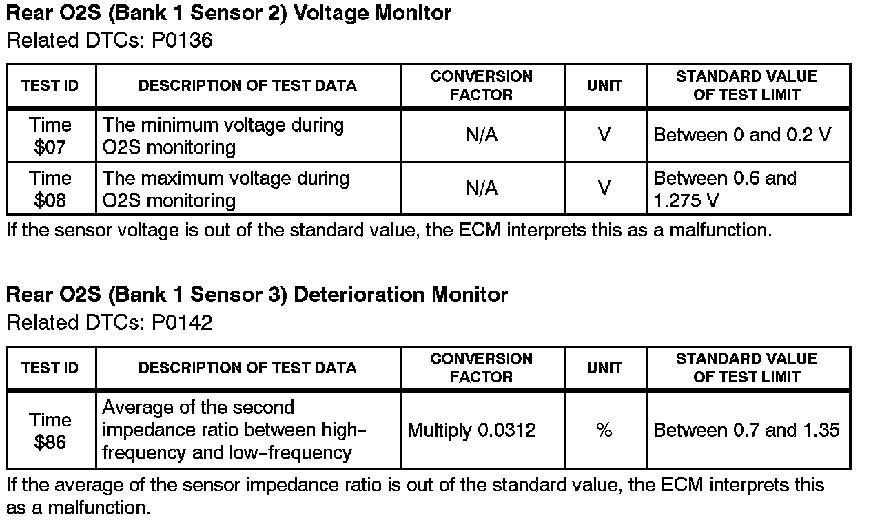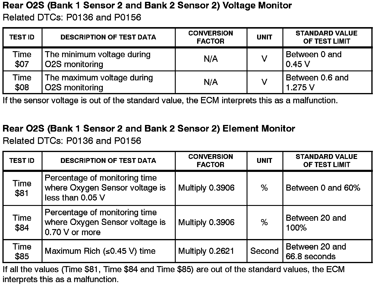 This Service Bulletin contains Oxygen Sensor (O2S) Monitor threshold values for all models from 1996 to 2003 and some 2004 models. Starting in 2004, the O2S Monitor threshold values can be found in the repair manual. These values are used when analyzing the O2S test results to determine the O2S condition.