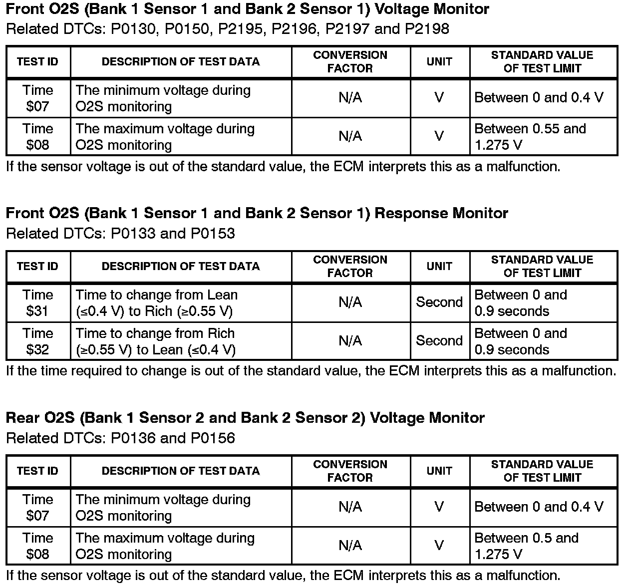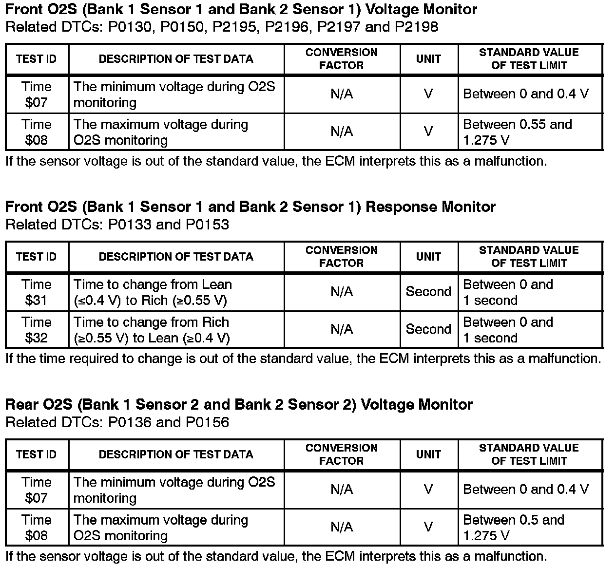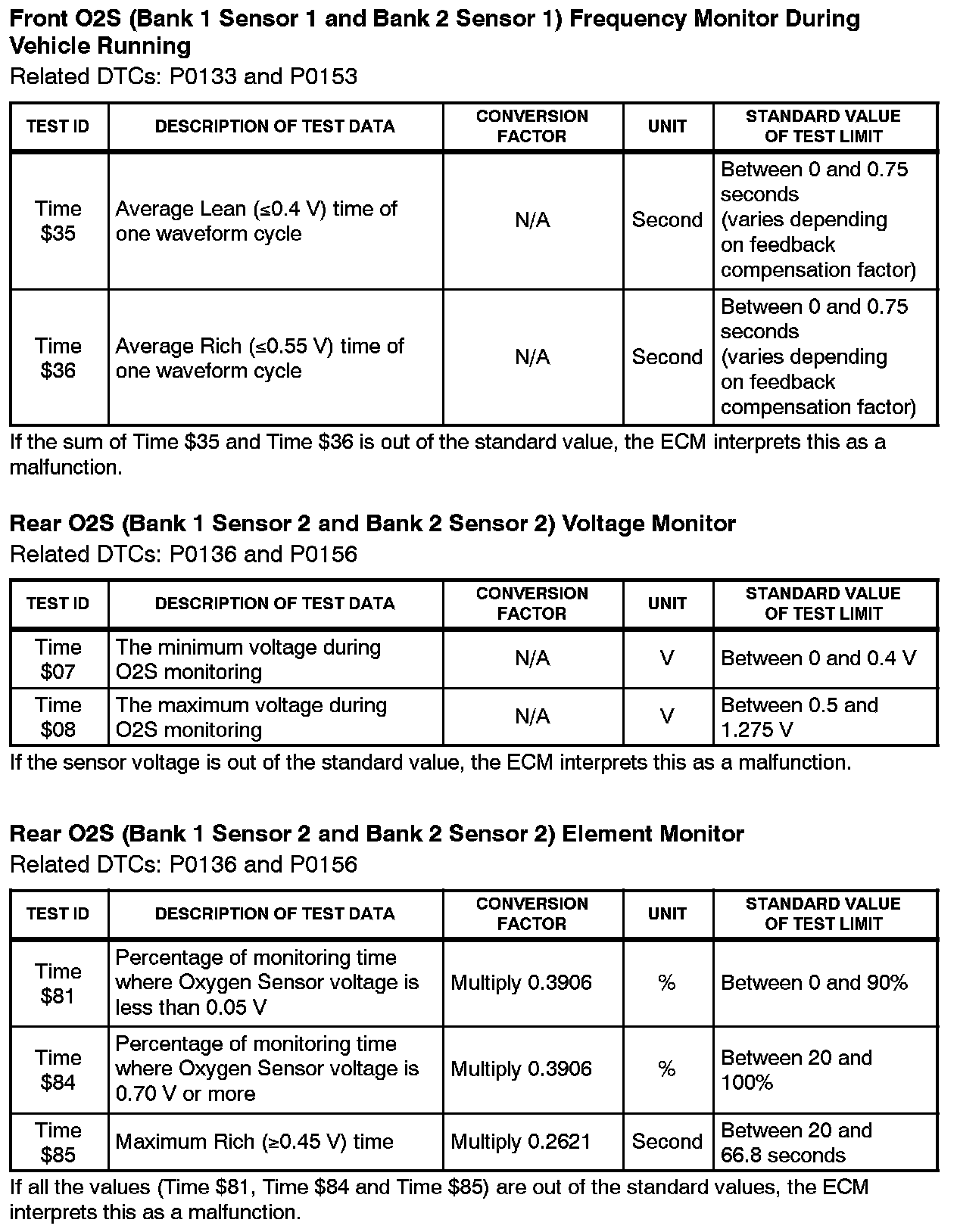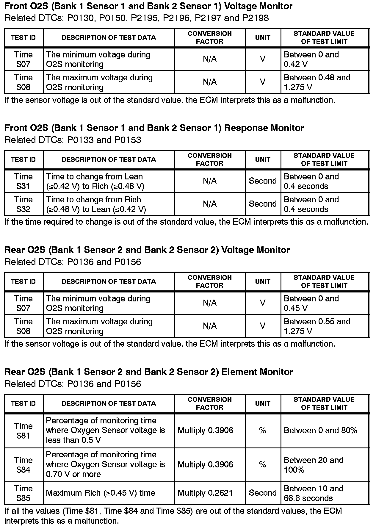 This Service Bulletin contains Oxygen Sensor (O2S) Monitor threshold values for all models from 1996 to 2003 and some 2004 models. Starting in 2004, the O2S Monitor threshold values can be found in the repair manual. These values are used when analyzing the O2S test results to determine the O2S condition.